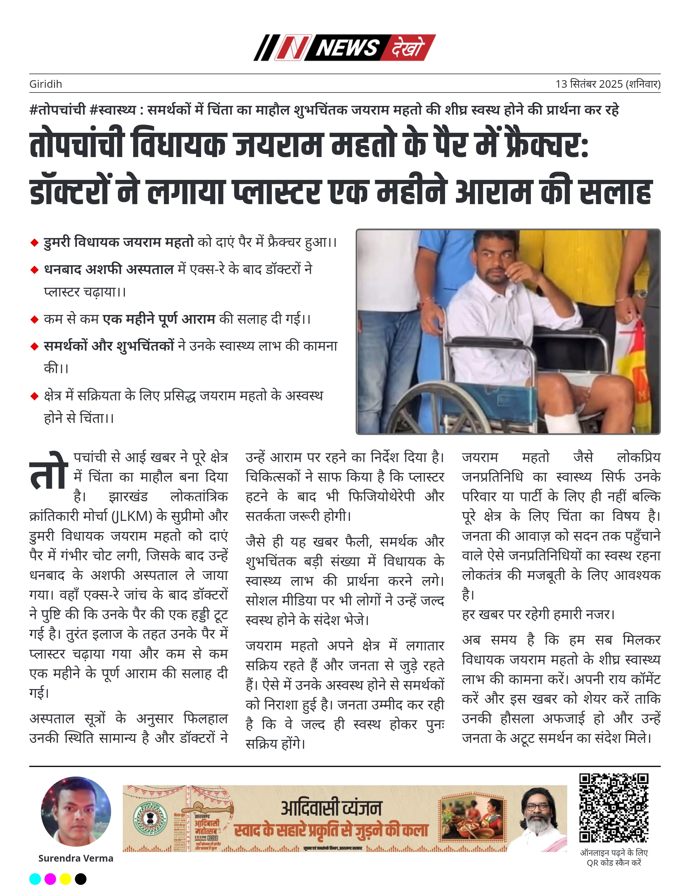 - डुमरी विधायक जयराम महतो को दाएं पैर में फ्रैक्चर हुआ।।