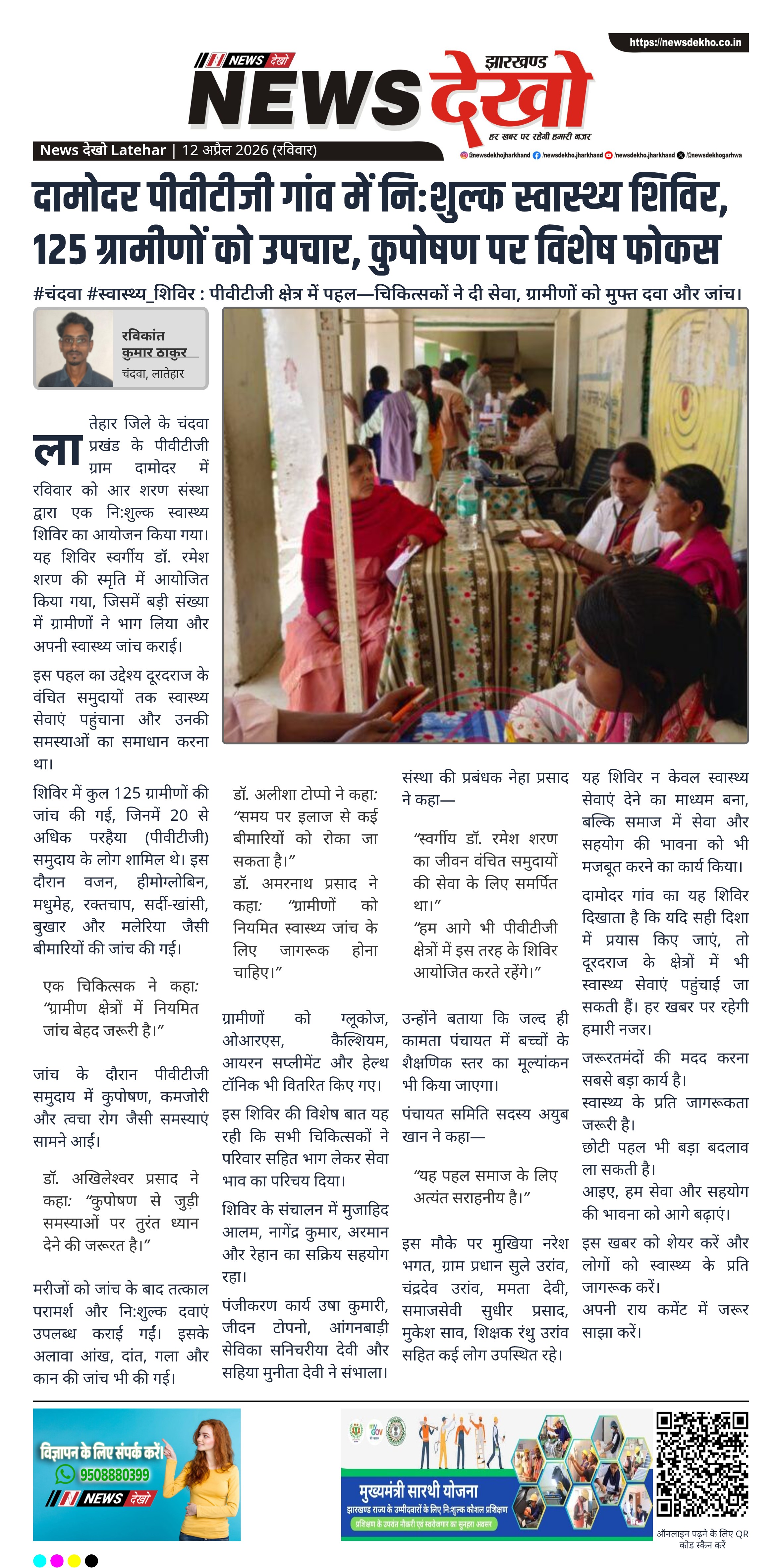लातेहार जिले के चंदवा प्रखंड के पीवीटीजी ग्राम दामोदर में रविवार को आर शरण संस्था द्वारा एक नि:शुल्क स्वास्थ्य शिविर का आयोजन किया गया। यह शिविर स्वर्गीय डॉ. रमेश शरण की स्मृति में आयोजित किया गया, जिसमें बड़ी संख्या में ग्रामीणों ने भाग लिया और अपनी स्वास्थ्य जांच कराई।