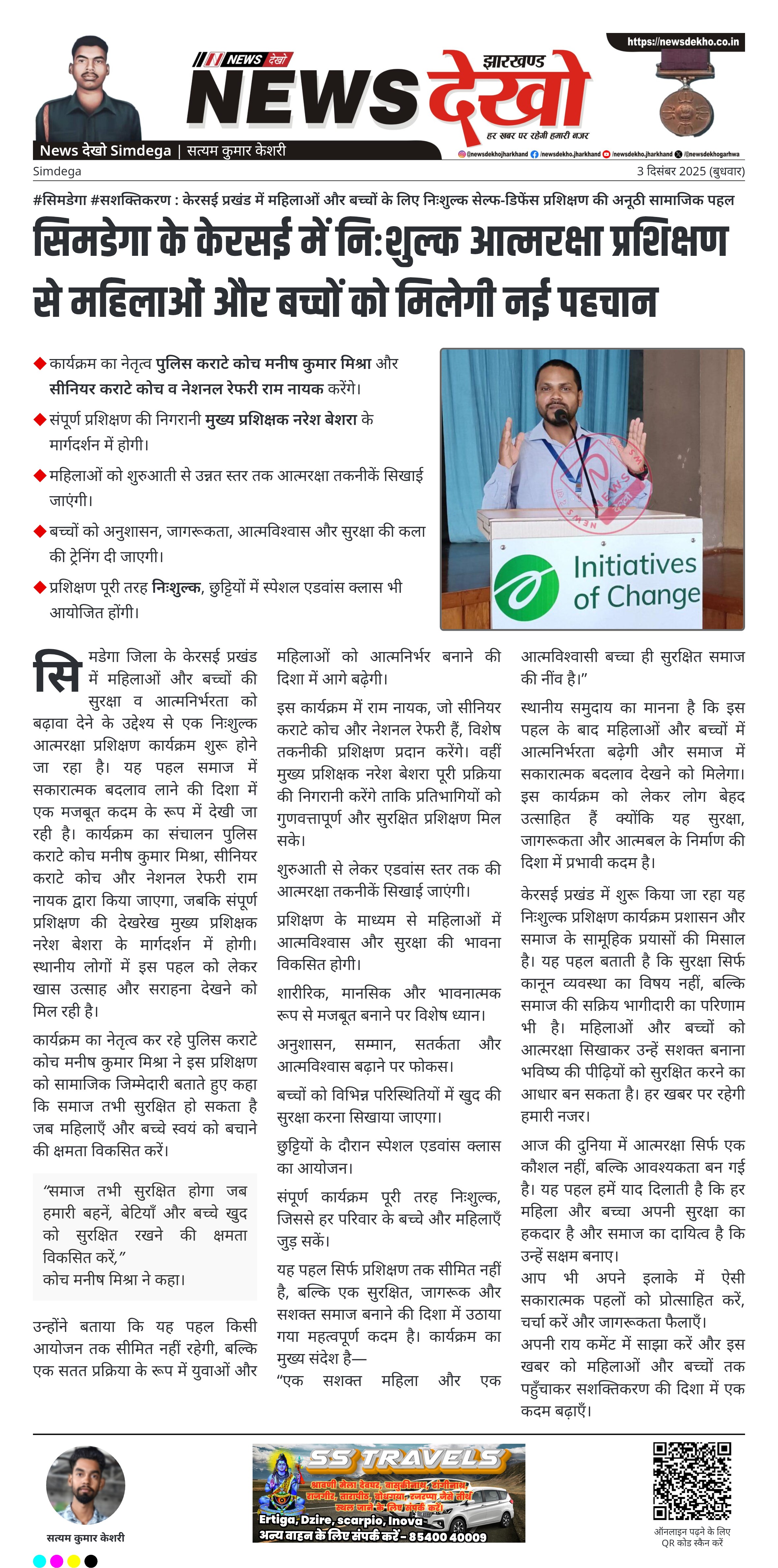 सिमडेगा जिला के केरसई प्रखंड में महिलाओं और बच्चों की सुरक्षा व आत्मनिर्भरता को बढ़ावा देने के उद्देश्य से एक निःशुल्क आत्मरक्षा प्रशिक्षण कार्यक्रम शुरू होने जा रहा है। यह पहल समाज में सकारात्मक बदलाव लाने की दिशा में एक मजबूत कदम के रूप में देखी जा रही है। कार्यक्रम का संचालन पुलिस कराटे कोच मनीष कुमार मिश्रा, सीनियर कराटे कोच और नेशनल रेफरी राम नायक द्वारा किया जाएगा, जबकि संपूर्ण प्रशिक्षण की देखरेख मुख्य प्रशिक्षक नरेश बेशरा के मार्गदर्शन में होगी। स्थानीय लोगों में इस पहल को लेकर खास उत्साह और सराहना देखने को मिल रही है।