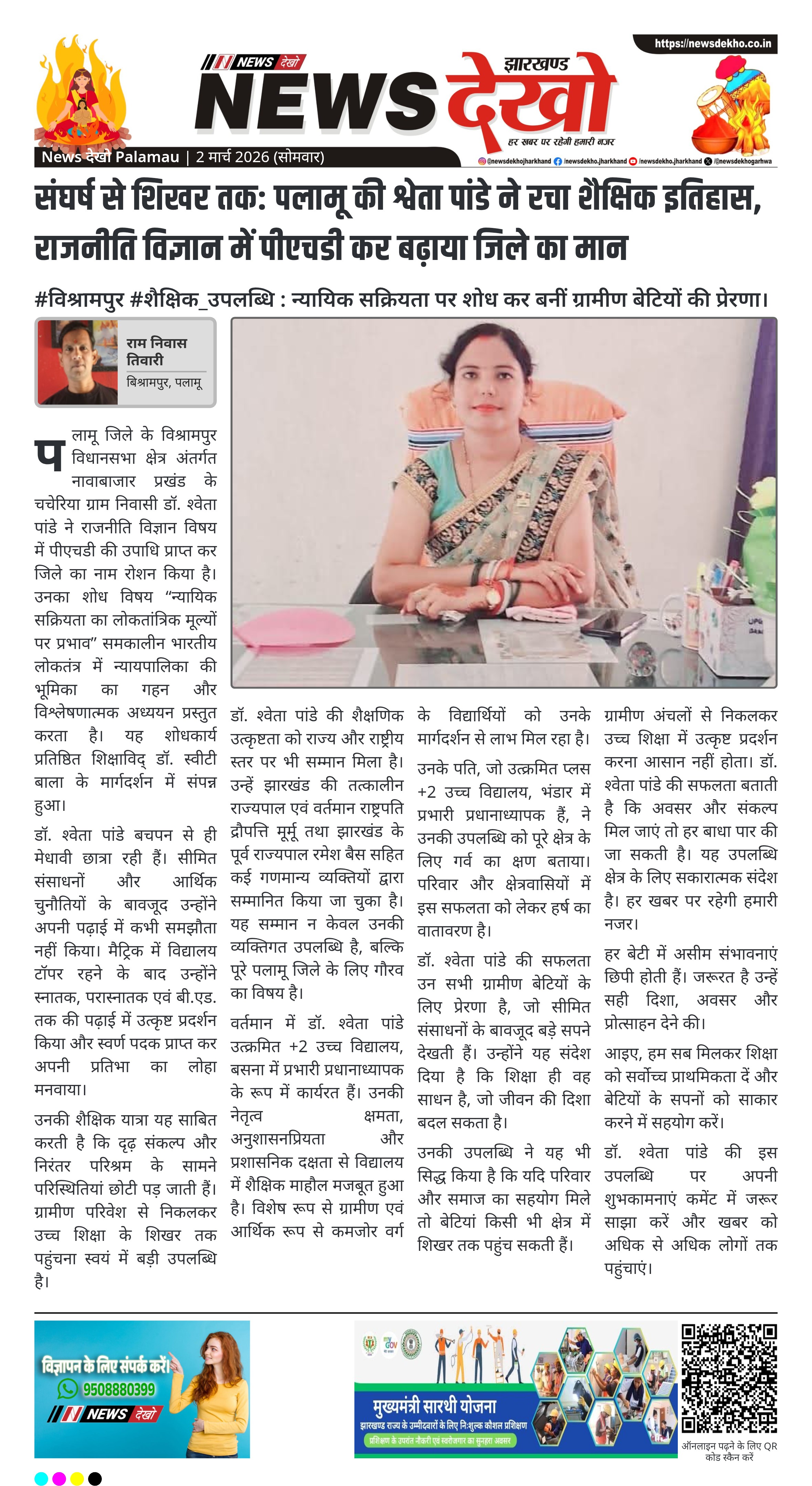 पलामू जिले के विश्रामपुर विधानसभा क्षेत्र अंतर्गत नावाबाजार प्रखंड के चचेरिया ग्राम निवासी डॉ. श्वेता पांडे ने राजनीति विज्ञान विषय में पीएचडी की उपाधि प्राप्त कर जिले का नाम रोशन किया है। उनका शोध विषय “न्यायिक सक्रियता का लोकतांत्रिक मूल्यों पर प्रभाव” समकालीन भारतीय लोकतंत्र में न्यायपालिका की भूमिका का गहन और विश्लेषणात्मक अध्ययन प्रस्तुत करता है। यह शोधकार्य प्रतिष्ठित शिक्षाविद् डॉ. स्वीटी बाला के मार्गदर्शन में संपन्न हुआ।