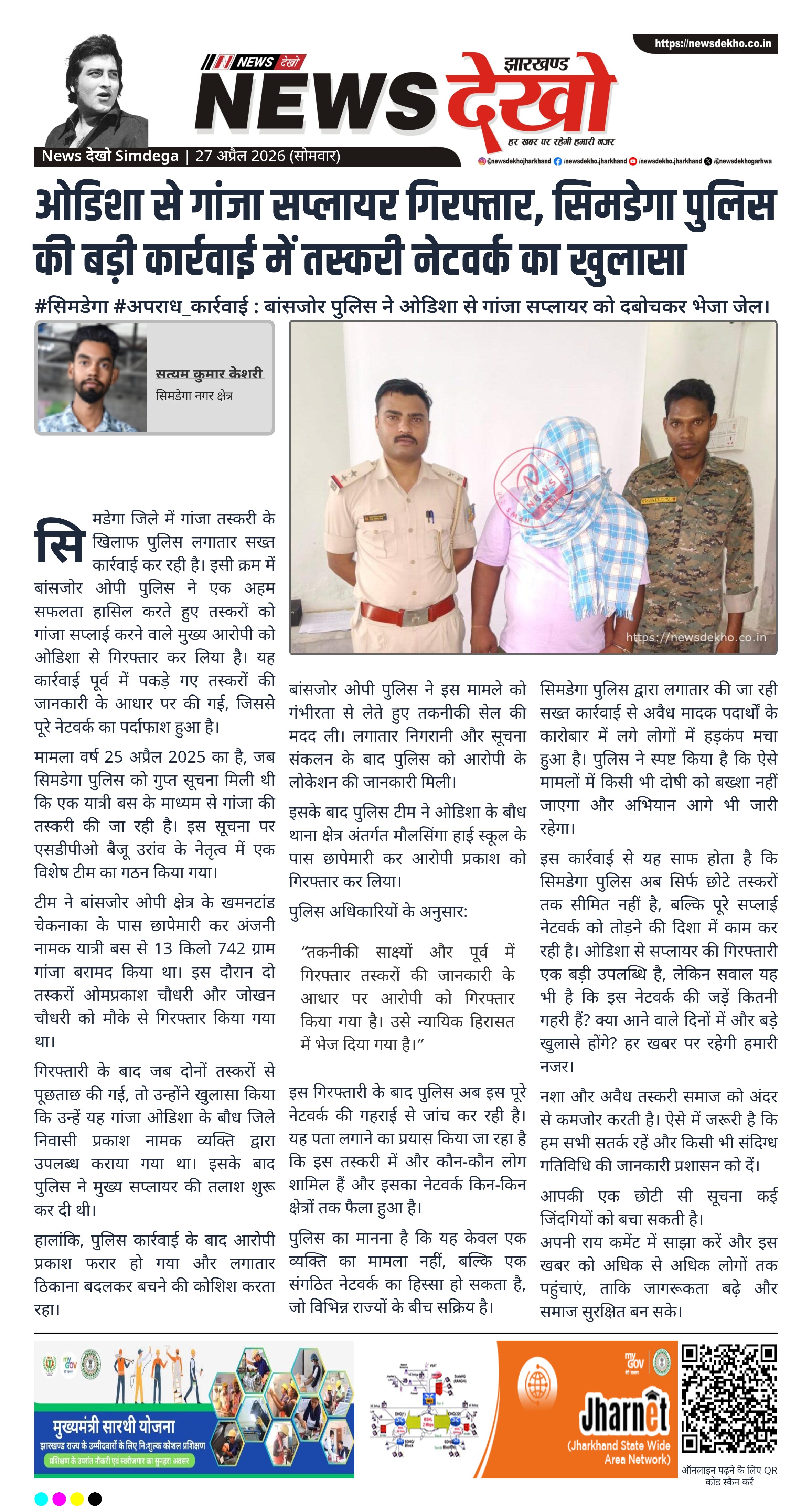सिमडेगा जिले की बांसजोर ओपी पुलिस ने गांजा तस्करी के मामले में बड़ी सफलता हासिल करते हुए ओडिशा से एक सप्लायर को गिरफ्तार किया है। यह कार्रवाई वर्ष 2025 में पकड़े गए तस्करों की निशानदेही पर की गई। तकनीकी जांच के आधार पर फरार आरोपी को पकड़कर न्यायिक हिरासत में भेज दिया गया। पुलिस इस नेटवर्क से जुड़े अन्य लोगों की भी जांच कर रही है।
