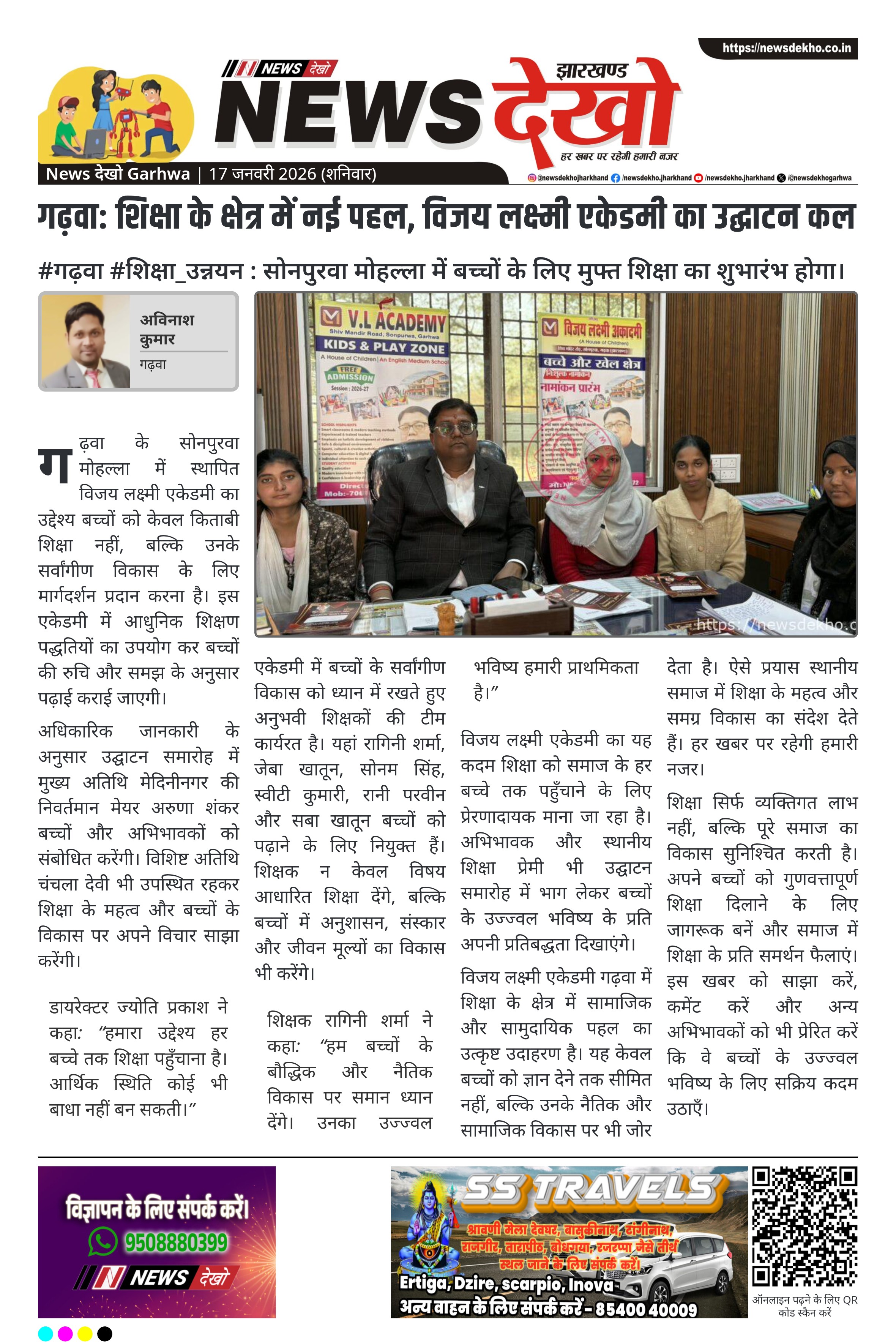 विजय लक्ष्मी एकेडमी गढ़वा में शिक्षा के क्षेत्र में सामाजिक और सामुदायिक पहल का उत्कृष्ट उदाहरण है। यह केवल बच्चों को ज्ञान देने तक सीमित नहीं, बल्कि उनके नैतिक और सामाजिक विकास पर भी जोर देता है। ऐसे प्रयास स्थानीय समाज में शिक्षा के महत्व और समग्र विकास का संदेश देते हैं। हर खबर पर रहेगी हमारी नजर।