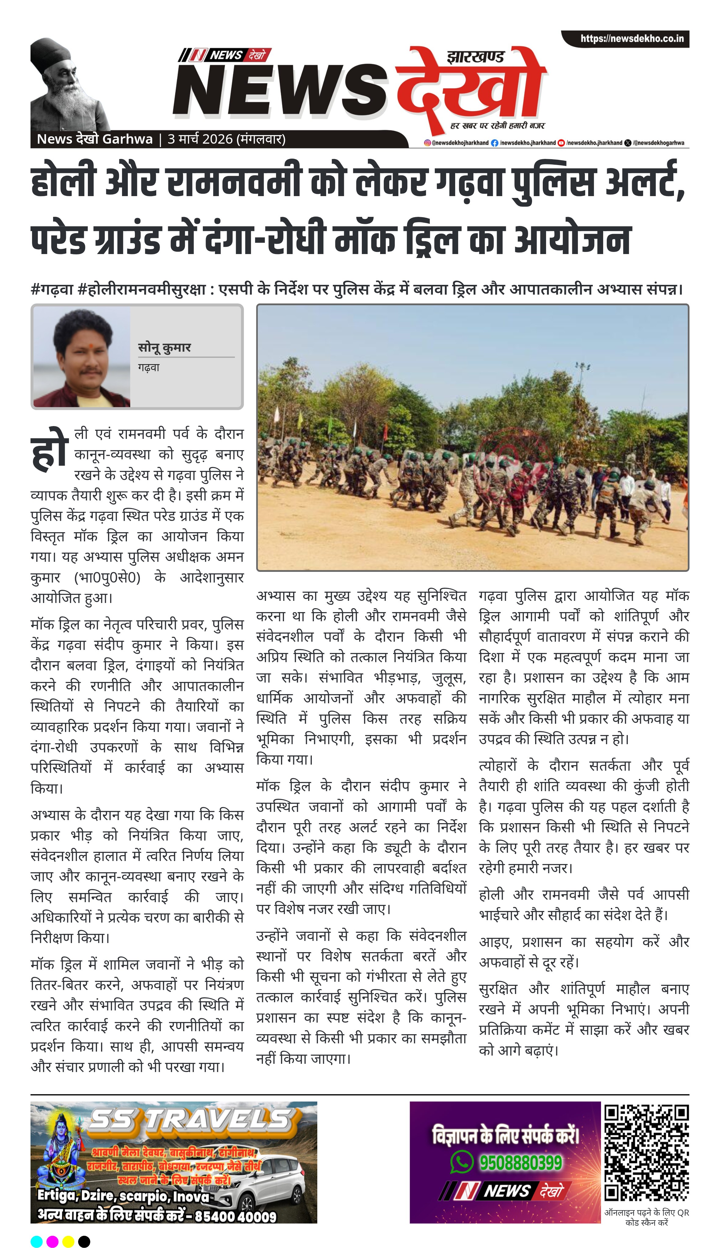 गढ़वा पुलिस द्वारा आयोजित यह मॉक ड्रिल आगामी पर्वों को शांतिपूर्ण और सौहार्दपूर्ण वातावरण में संपन्न कराने की दिशा में एक महत्वपूर्ण कदम माना जा रहा है। प्रशासन का उद्देश्य है कि आम नागरिक सुरक्षित माहौल में त्योहार मना सकें और किसी भी प्रकार की अफवाह या उपद्रव की स्थिति उत्पन्न न हो।