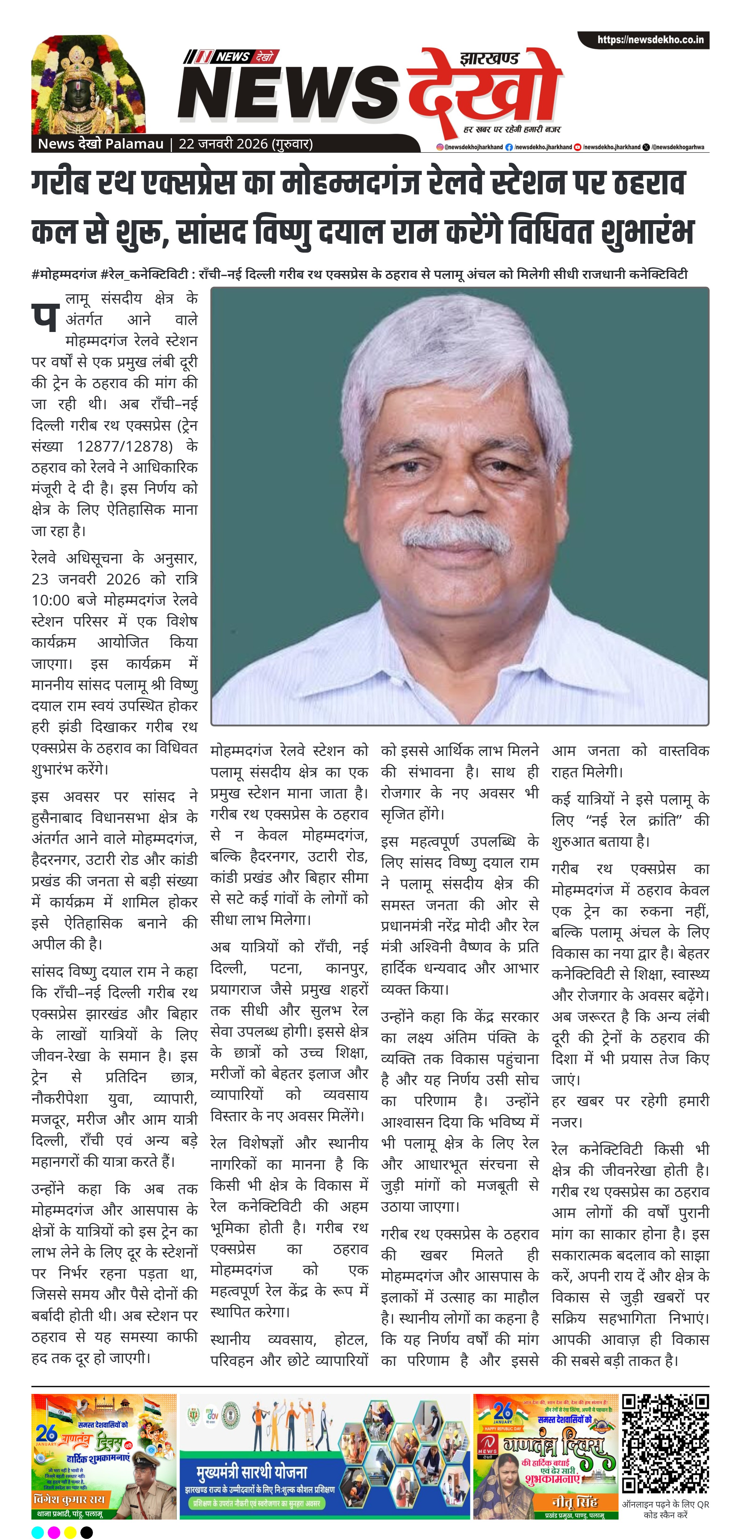 सांसद विष्णु दयाल राम ने कहा कि राँची–नई दिल्ली गरीब रथ एक्सप्रेस झारखंड और बिहार के लाखों यात्रियों के लिए जीवन-रेखा के समान है। इस ट्रेन से प्रतिदिन छात्र, नौकरीपेशा युवा, व्यापारी, मजदूर, मरीज और आम यात्री दिल्ली, राँची एवं अन्य बड़े महानगरों की यात्रा करते हैं।