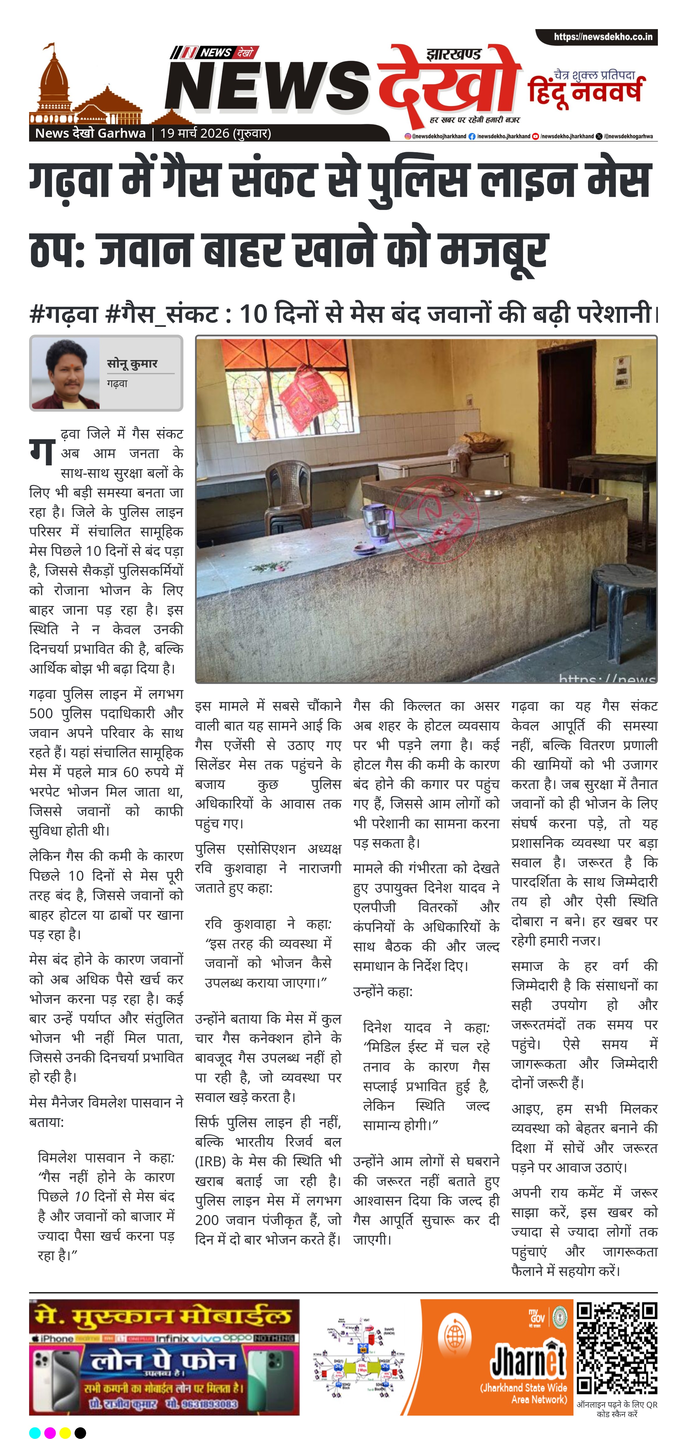 गढ़वा जिले में गैस संकट अब आम जनता के साथ-साथ सुरक्षा बलों के लिए भी बड़ी समस्या बनता जा रहा है। जिले के पुलिस लाइन परिसर में संचालित सामूहिक मेस पिछले 10 दिनों से बंद पड़ा है, जिससे सैकड़ों पुलिसकर्मियों को रोजाना भोजन के लिए बाहर जाना पड़ रहा है। इस स्थिति ने न केवल उनकी दिनचर्या प्रभावित की है, बल्कि आर्थिक बोझ भी बढ़ा दिया है।