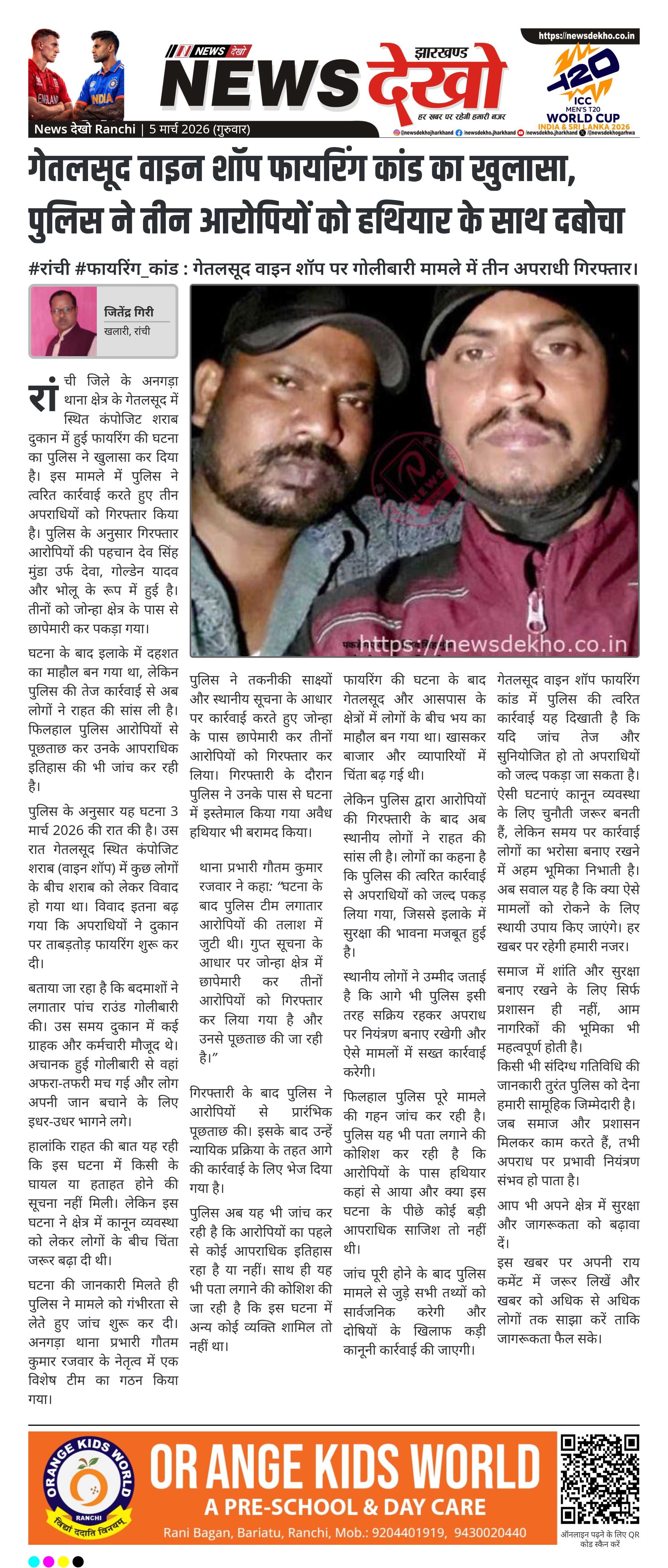 रांची जिले के अनगड़ा थाना क्षेत्र स्थित गेतलसूद की एक वाइन शॉप पर हुई फायरिंग मामले में पुलिस ने बड़ी सफलता हासिल की है। 3 मार्च की रात हुई इस घटना के बाद पुलिस ने त्वरित कार्रवाई करते हुए तीन आरोपियों को गिरफ्तार कर लिया। आरोपियों के पास से घटना में प्रयुक्त अवैध हथियार भी बरामद किए गए हैं।