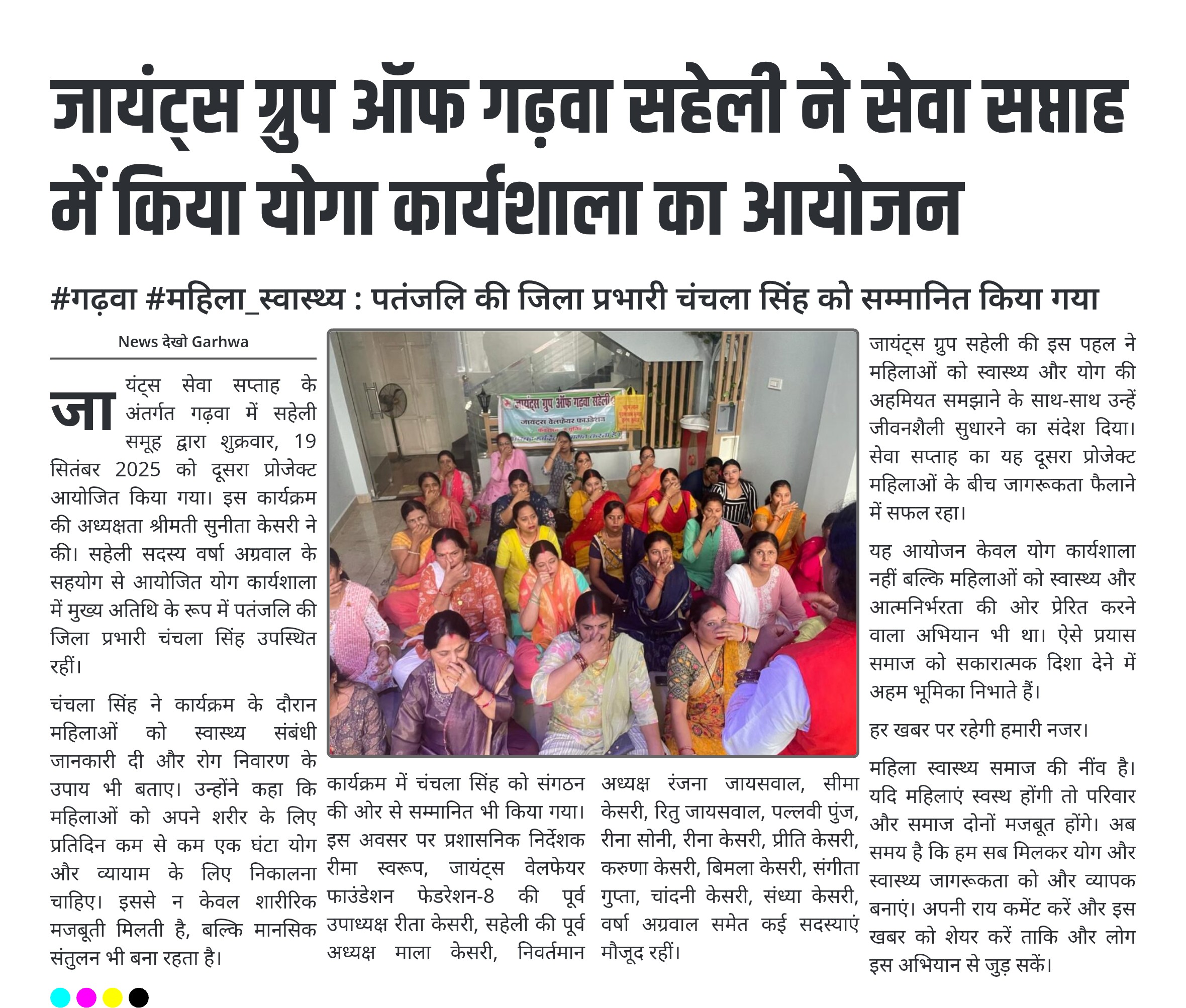 जायंट्स सेवा सप्ताह के अंतर्गत गढ़वा में सहेली समूह द्वारा शुक्रवार, 19 सितंबर 2025 को दूसरा प्रोजेक्ट आयोजित किया गया। इस कार्यक्रम की अध्यक्षता श्रीमती सुनीता केसरी ने की। सहेली सदस्य वर्षा अग्रवाल के सहयोग से आयोजित योग कार्यशाला में मुख्य अतिथि के रूप में पतंजलि की जिला प्रभारी चंचला सिंह उपस्थित रहीं।