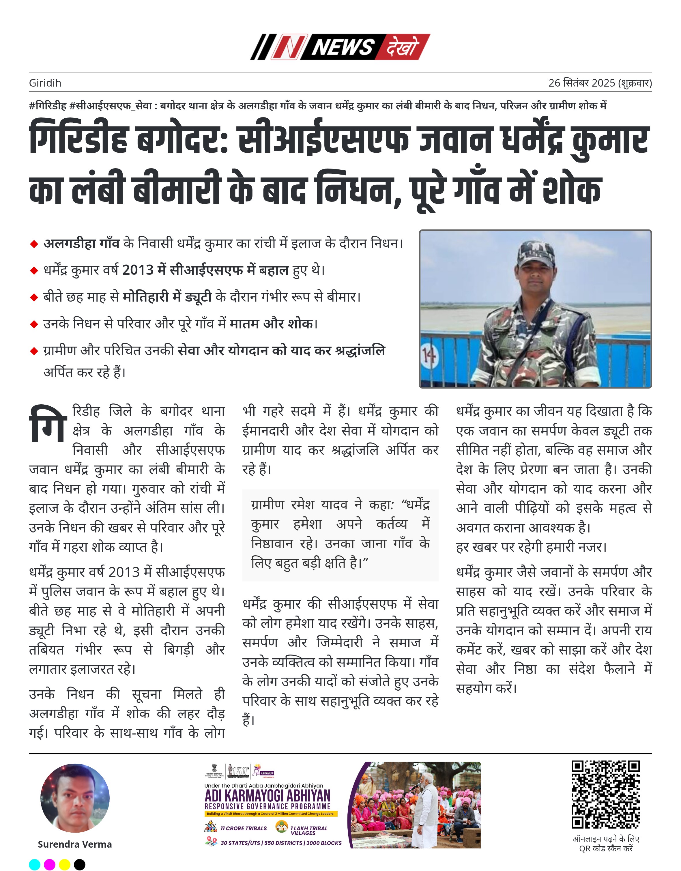 #गिरिडीह #सीआईएसएफ_सेवा : बगोदर थाना क्षेत्र के अलगडीहा गाँव के जवान धर्मेंद्र कुमार का लंबी बीमारी के बाद निधन, परिजन और ग्रामीण शोक में