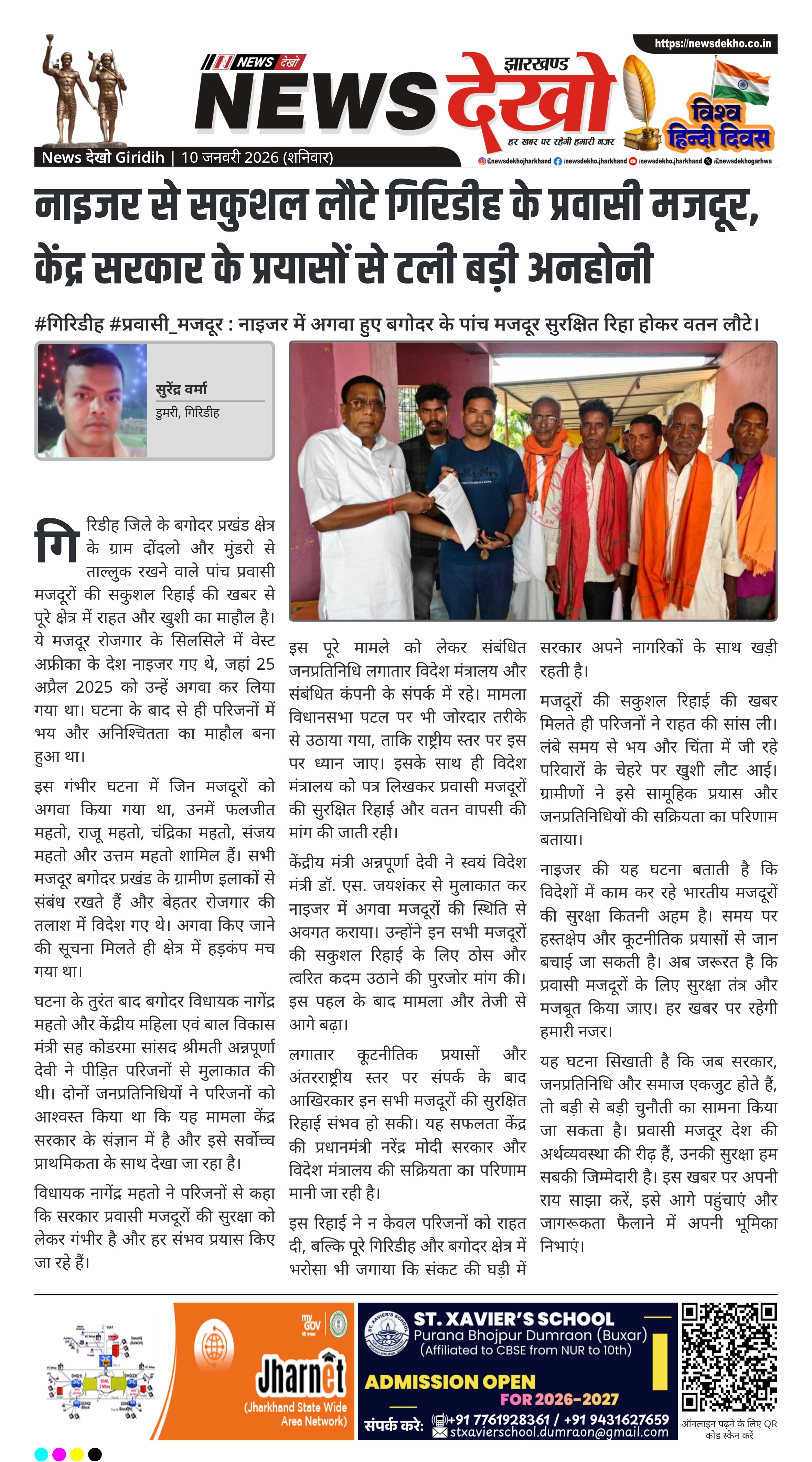 गिरिडीह जिले के बगोदर प्रखंड के पांच प्रवासी मजदूरों की नाइजर से सुरक्षित रिहाई का रास्ता साफ हो गया है। 25 अप्रैल 2025 को वेस्ट अफ्रीका के देश नाइजर में अगवा किए गए इन मजदूरों को केंद्र सरकार के सतत प्रयासों से मुक्त कराया गया। विदेश मंत्रालय, जनप्रतिनिधियों और परिजनों के निरंतर संपर्क व दबाव के बाद यह बड़ी सफलता मिली है। इस घटना ने प्रवासी मजदूरों की सुरक्षा को लेकर राष्ट्रीय स्तर पर चिंता और संवेदनशीलता को उजागर किया।