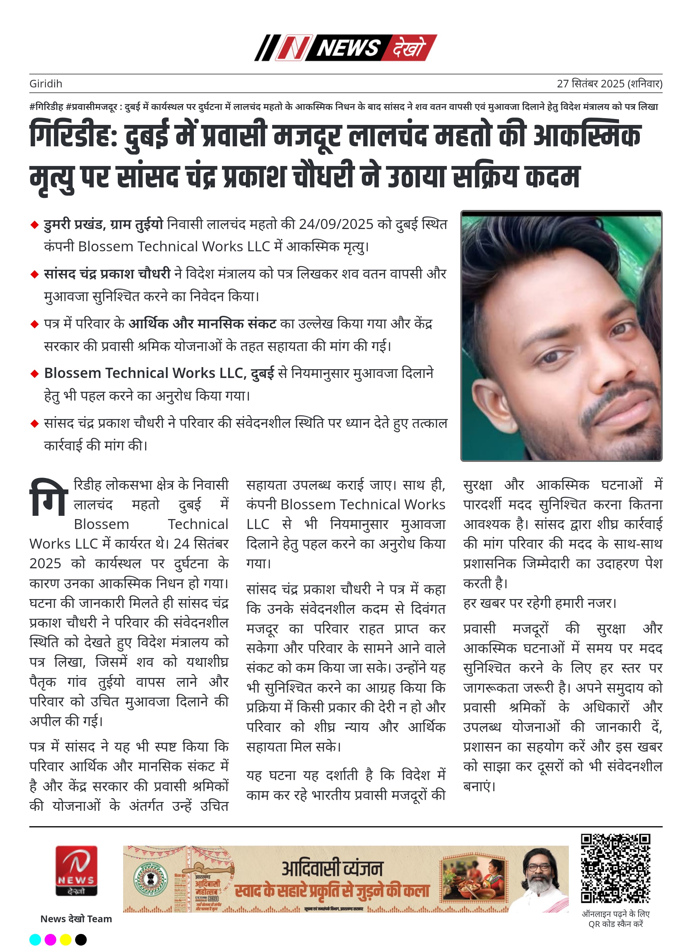 गिरिडीह लोकसभा क्षेत्र के निवासी लालचंद महतो दुबई में Blossem Technical Works LLC में कार्यरत थे। 24 सितंबर 2025 को कार्यस्थल पर दुर्घटना के कारण उनका आकस्मिक निधन हो गया। घटना की जानकारी मिलते ही सांसद चंद्र प्रकाश चौधरी ने परिवार की संवेदनशील स्थिति को देखते हुए विदेश मंत्रालय को पत्र लिखा, जिसमें शव को यथाशीघ्र पैतृक गांव तुईयो वापस लाने और परिवार को उचित मुआवजा दिलाने की अपील की गई।