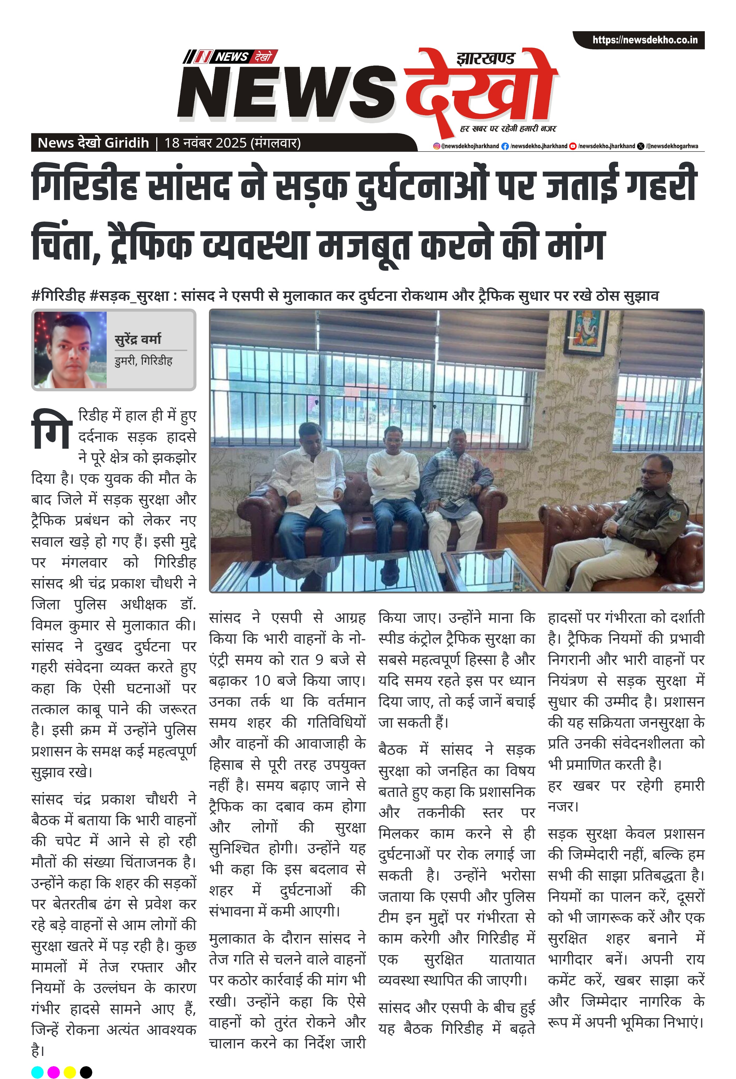 गिरिडीह में हाल ही में हुए दर्दनाक सड़क हादसे ने पूरे क्षेत्र को झकझोर दिया है। एक युवक की मौत के बाद जिले में सड़क सुरक्षा और ट्रैफिक प्रबंधन को लेकर नए सवाल खड़े हो गए हैं। इसी मुद्दे पर मंगलवार को गिरिडीह सांसद श्री चंद्र प्रकाश चौधरी ने जिला पुलिस अधीक्षक डॉ. विमल कुमार से मुलाकात की। सांसद ने दुखद दुर्घटना पर गहरी संवेदना व्यक्त करते हुए कहा कि ऐसी घटनाओं पर तत्काल काबू पाने की जरूरत है। इसी क्रम में उन्होंने पुलिस प्रशासन के समक्ष कई महत्वपूर्ण सुझाव रखे।