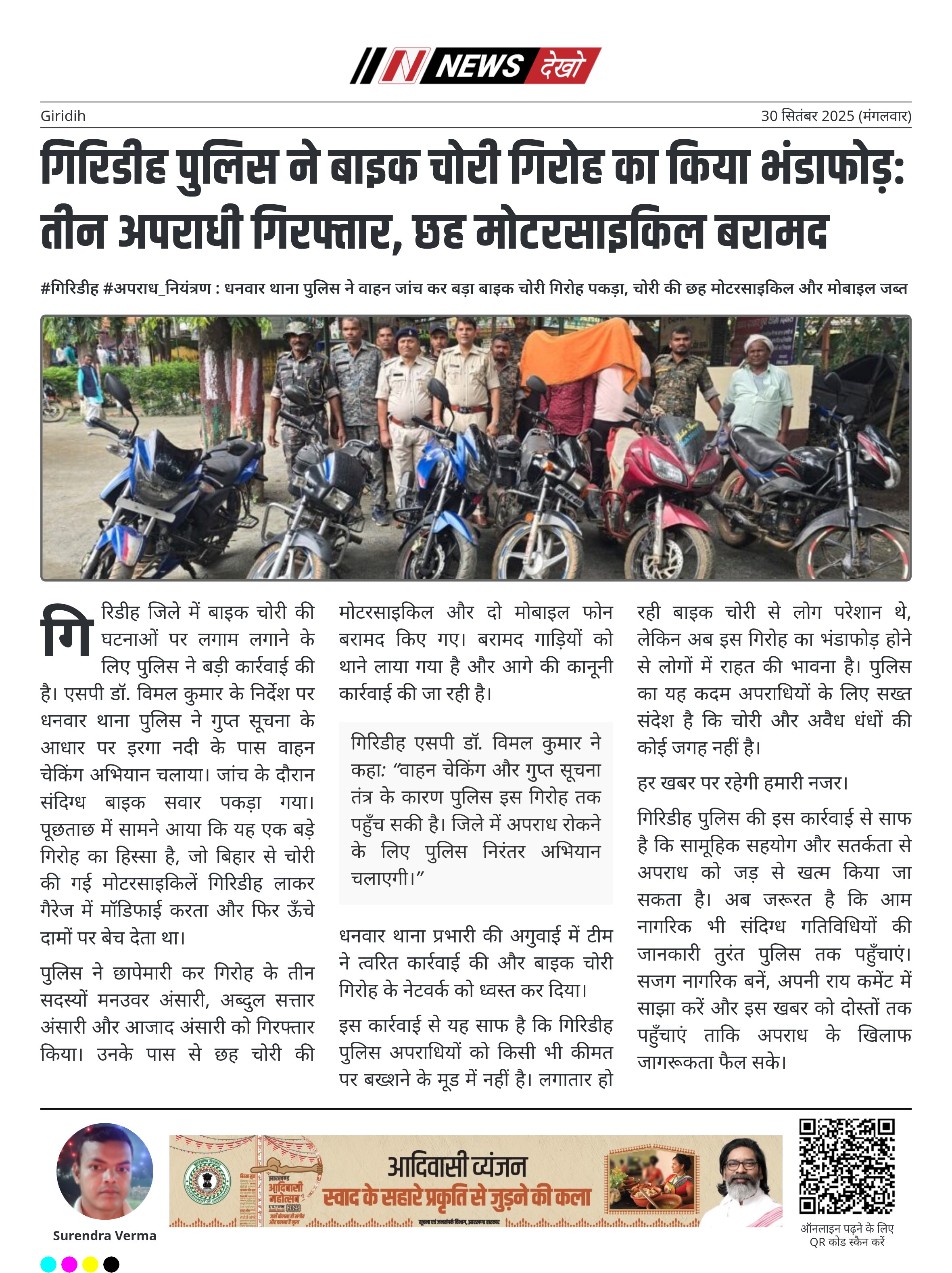 गिरिडीह पुलिस ने बाइक चोरी गिरोह का किया भंडाफोड़: तीन अपराधी गिरफ्तार, छह मोटरसाइकिल बरामद