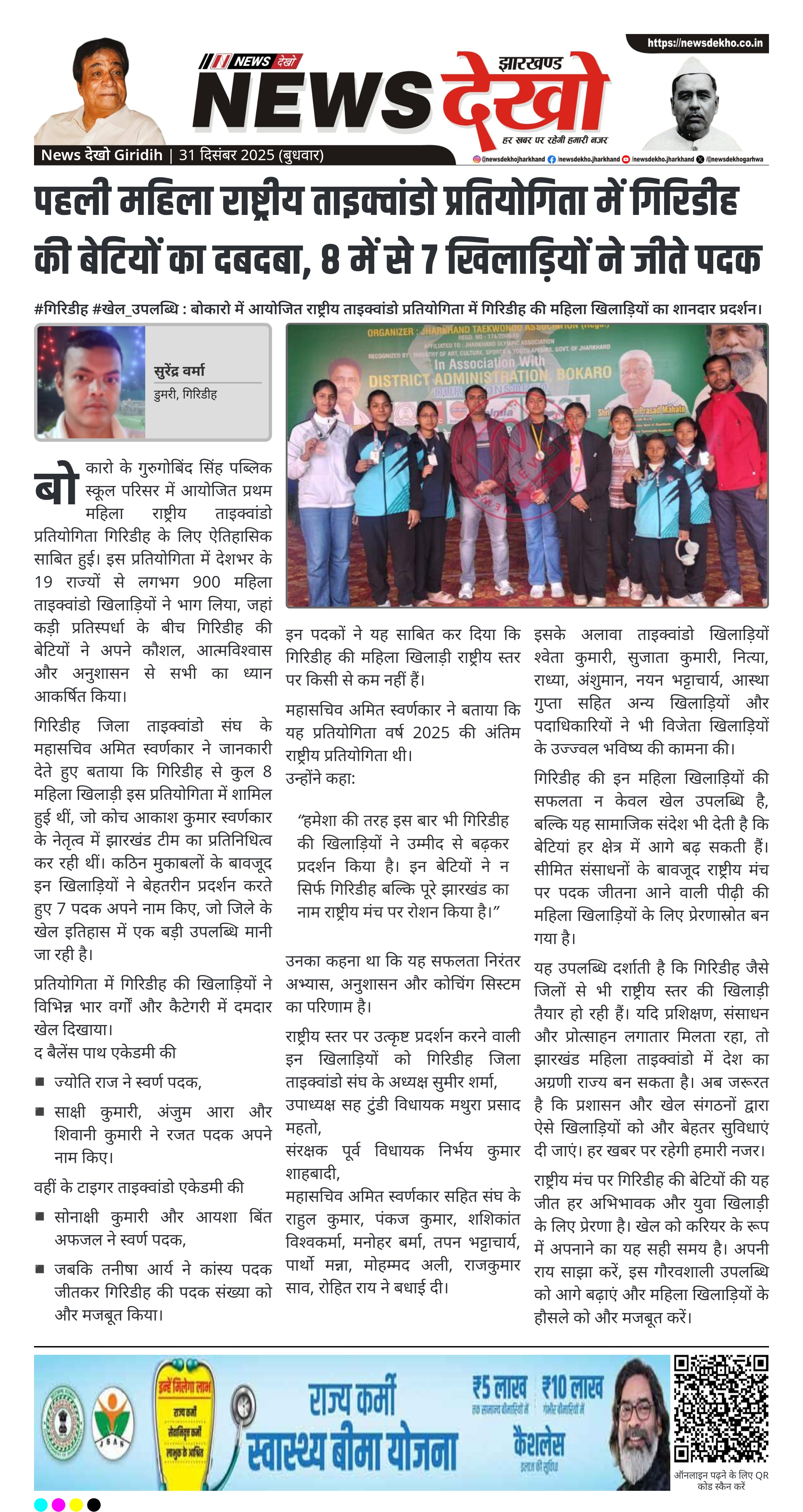 बोकारो के गुरुगोबिंद सिंह पब्लिक स्कूल परिसर में आयोजित प्रथम महिला राष्ट्रीय ताइक्वांडो प्रतियोगिता गिरिडीह के लिए ऐतिहासिक साबित हुई। इस प्रतियोगिता में देशभर के 19 राज्यों से लगभग 900 महिला ताइक्वांडो खिलाड़ियों ने भाग लिया, जहां कड़ी प्रतिस्पर्धा के बीच गिरिडीह की बेटियों ने अपने कौशल, आत्मविश्वास और अनुशासन से सभी का ध्यान आकर्षित किया।