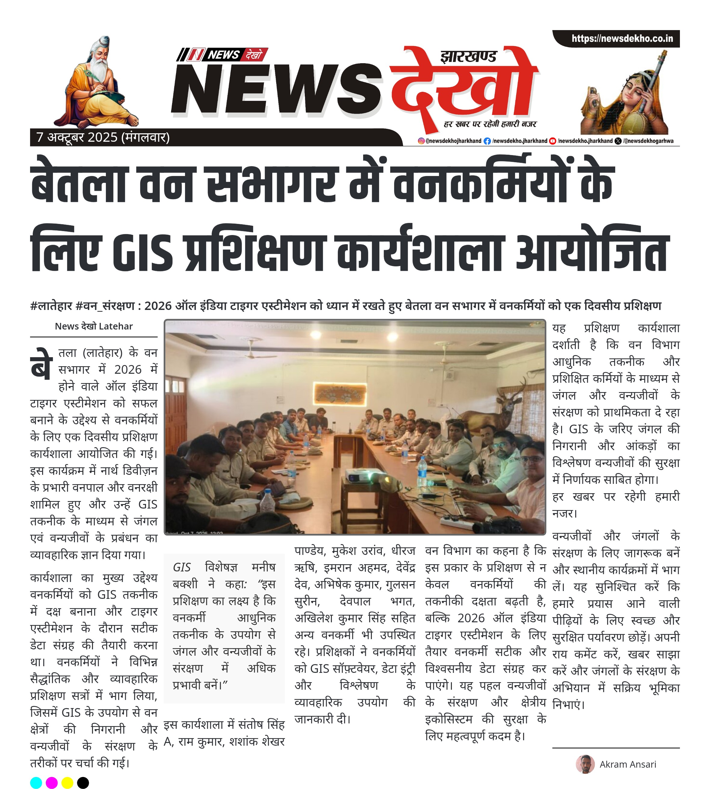 बेतला (लातेहार) के वन सभागर में 2026 में होने वाले ऑल इंडिया टाइगर एस्टीमेशन को सफल बनाने के उद्देश्य से वनकर्मियों के लिए एक दिवसीय प्रशिक्षण कार्यशाला आयोजित की गई। इस कार्यक्रम में नार्थ डिवीज़न के प्रभारी वनपाल और वनरक्षी शामिल हुए और उन्हें GIS तकनीक के माध्यम से जंगल एवं वन्यजीवों के प्रबंधन का व्यावहारिक ज्ञान दिया गया।