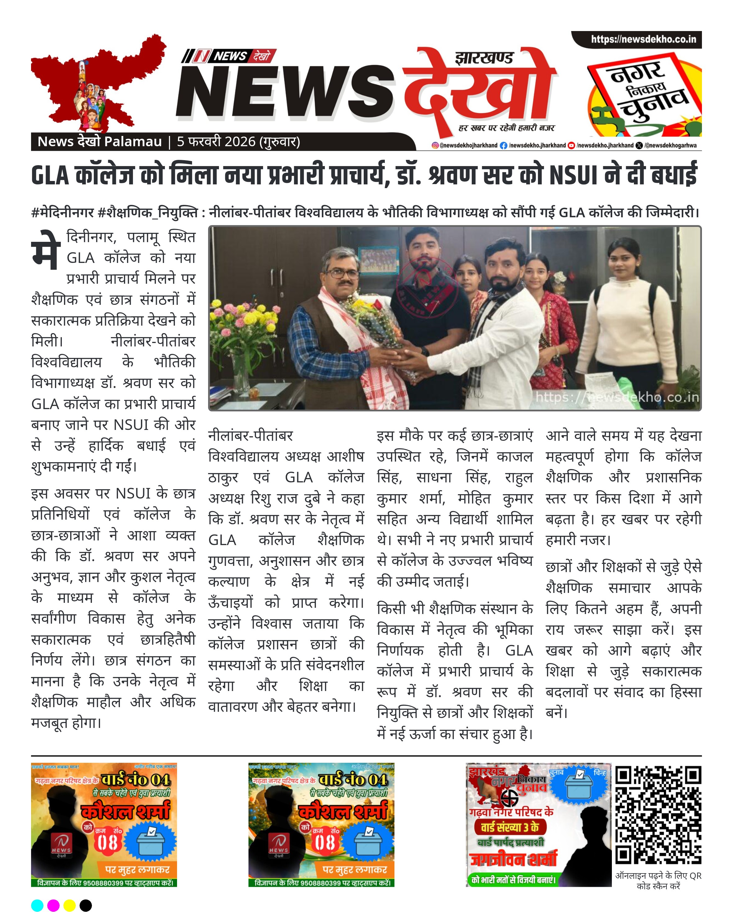 #मेदिनीनगर #शैक्षणिक_नियुक्ति : नीलांबर-पीतांबर विश्वविद्यालय के भौतिकी विभागाध्यक्ष को सौंपी गई GLA कॉलेज की जिम्मेदारी।