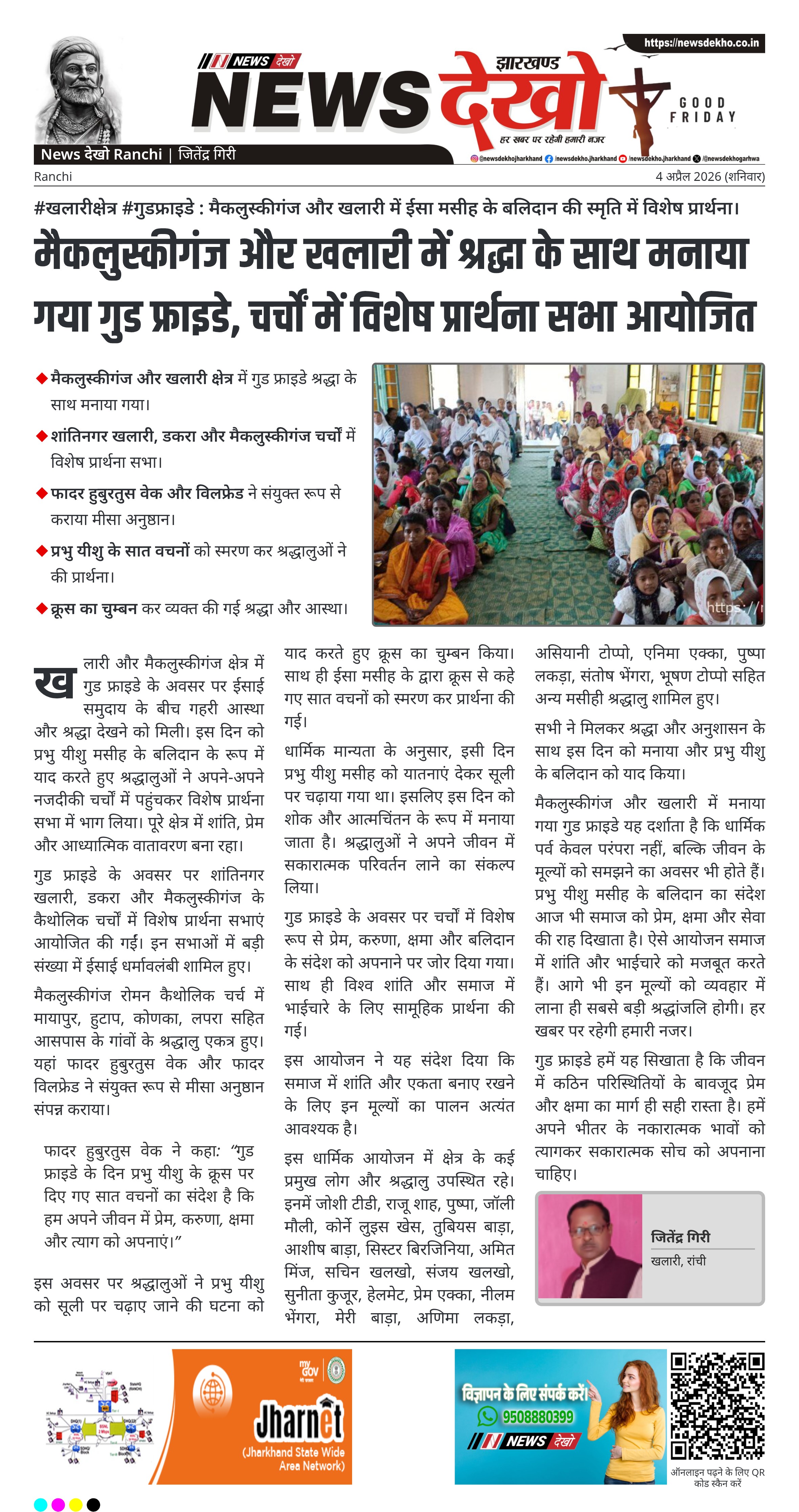 - मैकलुस्कीगंज और खलारी क्षेत्र में गुड फ्राइडे श्रद्धा के साथ मनाया गया।
