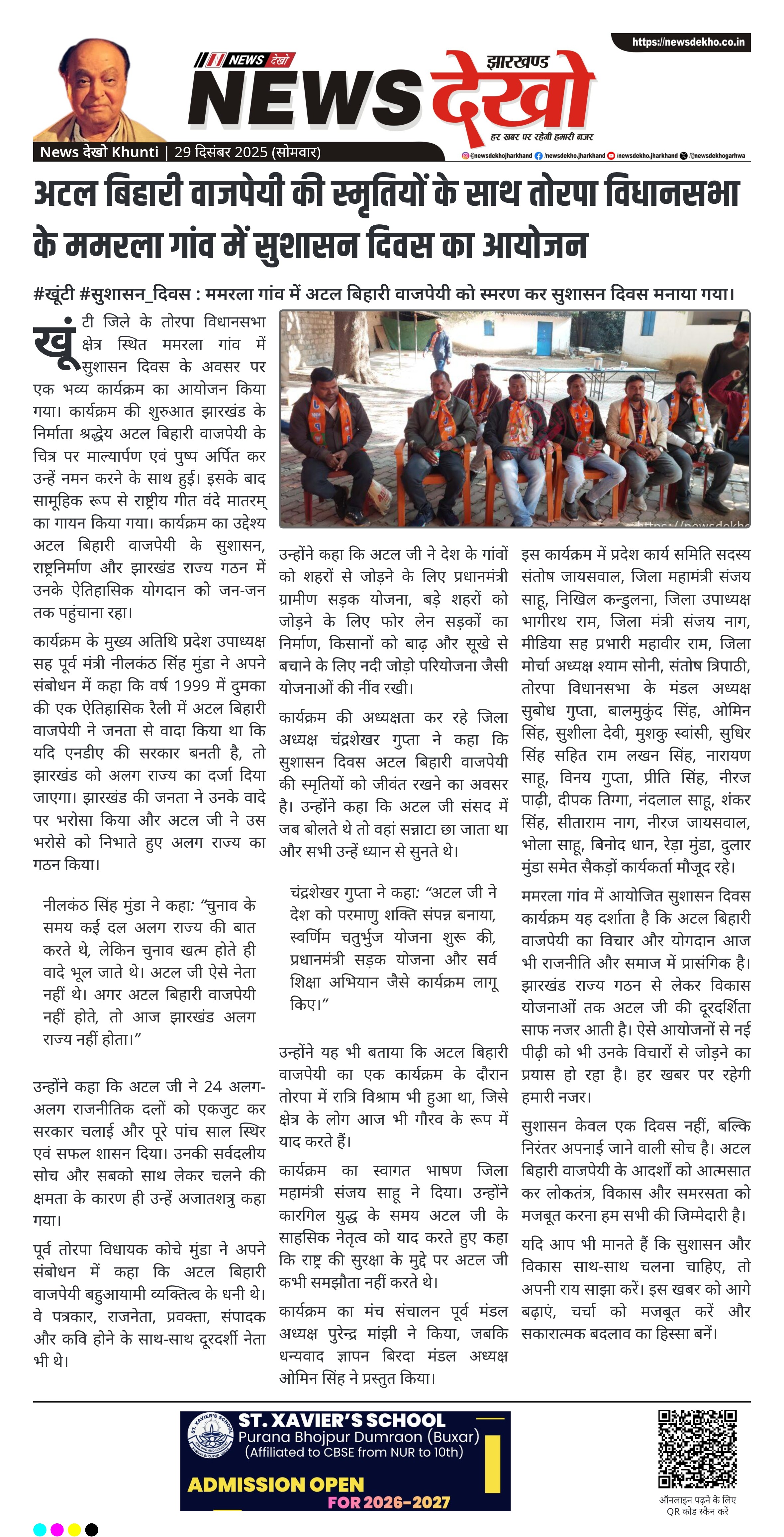 खूंटी जिले के तोरपा विधानसभा क्षेत्र स्थित ममरला गांव में सुशासन दिवस के अवसर पर एक भव्य कार्यक्रम का आयोजन किया गया। कार्यक्रम की शुरुआत झारखंड के निर्माता श्रद्धेय अटल बिहारी वाजपेयी के चित्र पर माल्यार्पण एवं पुष्प अर्पित कर उन्हें नमन करने के साथ हुई। इसके बाद सामूहिक रूप से राष्ट्रीय गीत वंदे मातरम् का गायन किया गया। कार्यक्रम का उद्देश्य अटल बिहारी वाजपेयी के सुशासन, राष्ट्रनिर्माण और झारखंड राज्य गठन में उनके ऐतिहासिक योगदान को जन-जन तक पहुंचाना रहा।