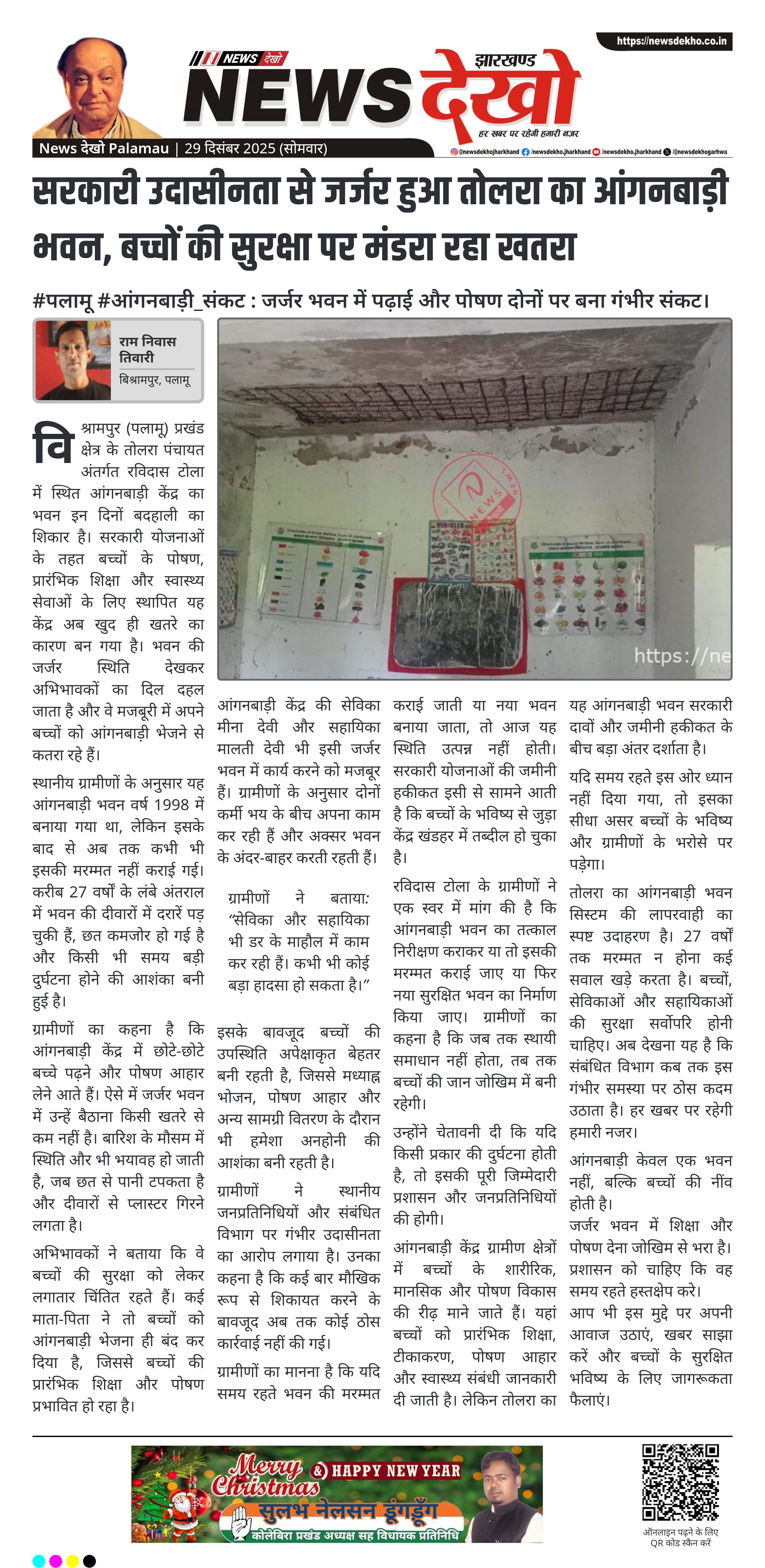 तोलरा का आंगनबाड़ी भवन सिस्टम की लापरवाही का स्पष्ट उदाहरण है। 27 वर्षों तक मरम्मत न होना कई सवाल खड़े करता है। बच्चों, सेविकाओं और सहायिकाओं की सुरक्षा सर्वोपरि होनी चाहिए। अब देखना यह है कि संबंधित विभाग कब तक इस गंभीर समस्या पर ठोस कदम उठाता है। हर खबर पर रहेगी हमारी नजर।