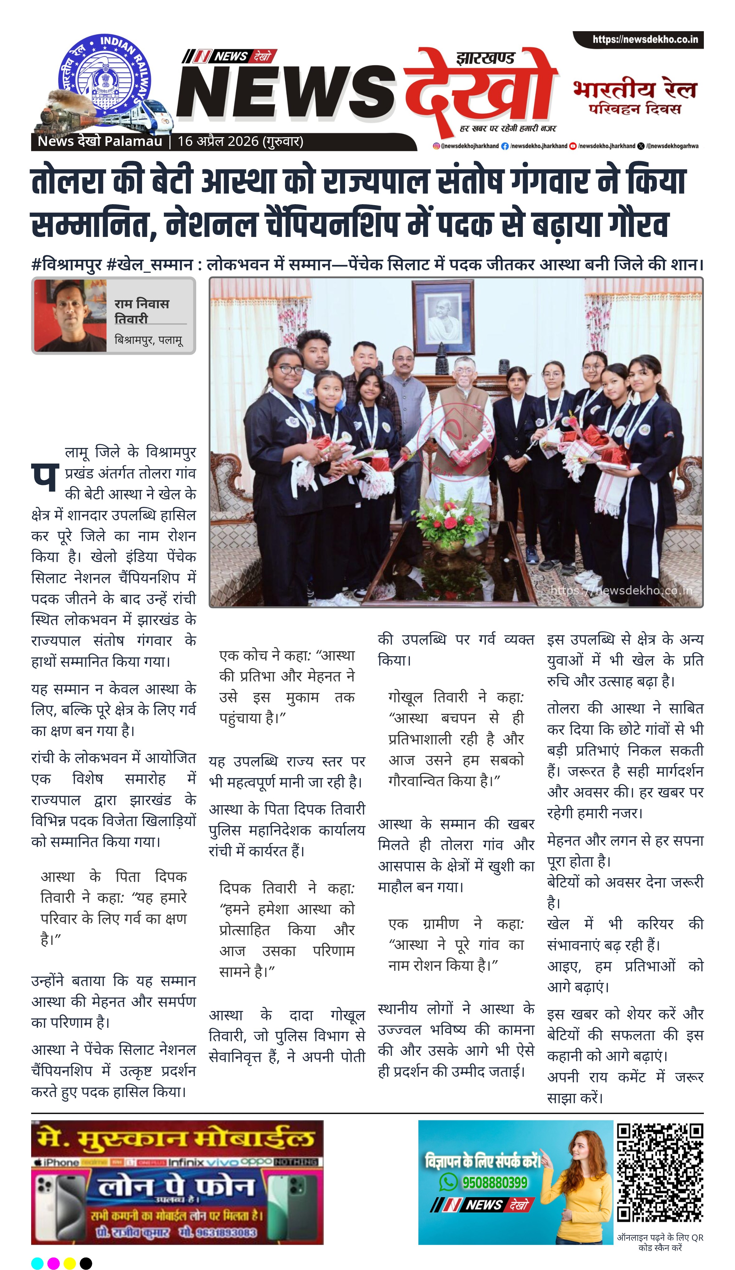 पलामू जिले के विश्रामपुर प्रखंड अंतर्गत तोलरा गांव की बेटी आस्था ने खेल के क्षेत्र में शानदार उपलब्धि हासिल कर पूरे जिले का नाम रोशन किया है। खेलो इंडिया पेंचेक सिलाट नेशनल चैंपियनशिप में पदक जीतने के बाद उन्हें रांची स्थित लोकभवन में झारखंड के राज्यपाल संतोष गंगवार के हाथों सम्मानित किया गया।