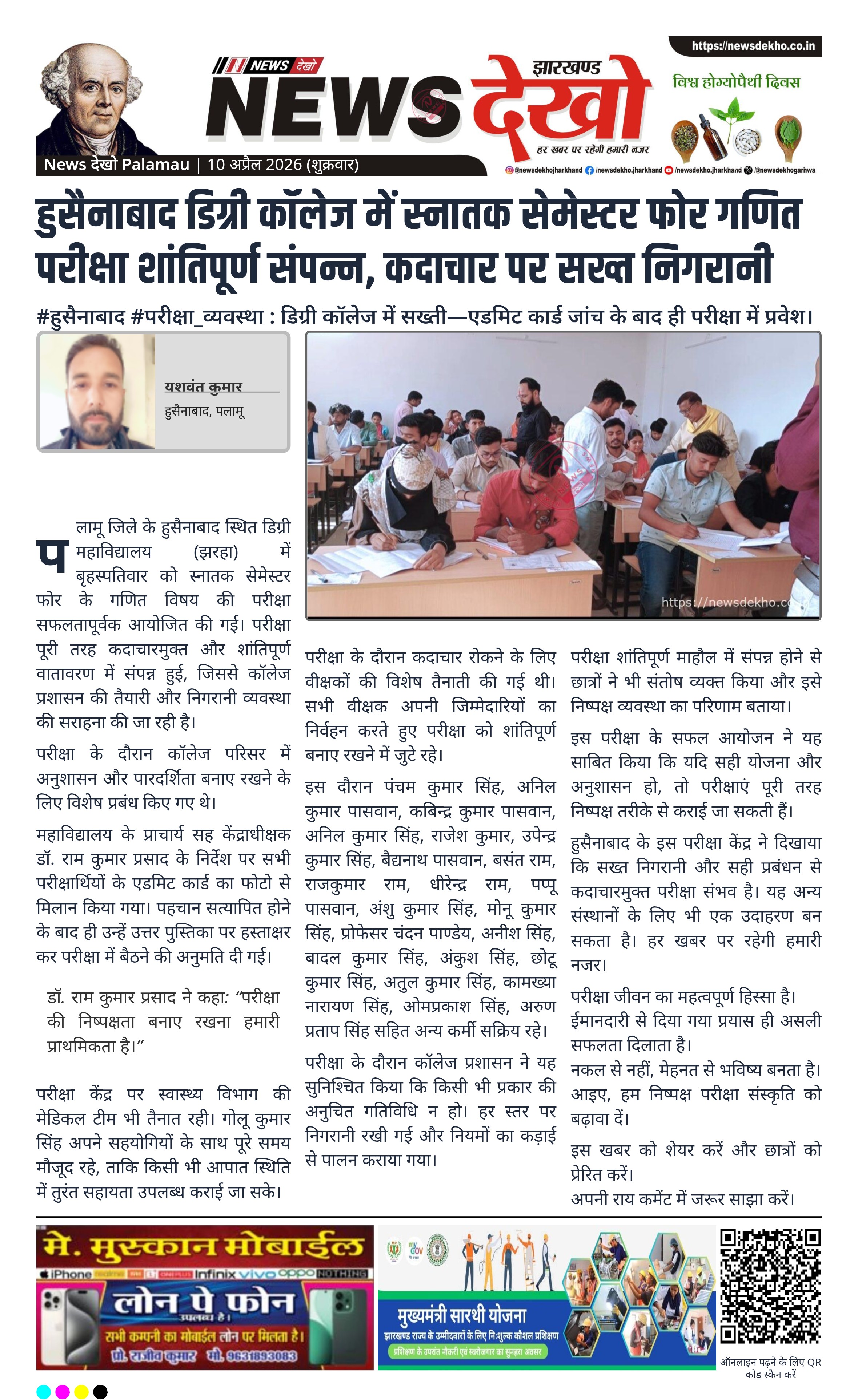 पलामू जिले के हुसैनाबाद स्थित डिग्री महाविद्यालय (झरहा) में बृहस्पतिवार को स्नातक सेमेस्टर फोर के गणित विषय की परीक्षा सफलतापूर्वक आयोजित की गई। परीक्षा पूरी तरह कदाचारमुक्त और शांतिपूर्ण वातावरण में संपन्न हुई, जिससे कॉलेज प्रशासन की तैयारी और निगरानी व्यवस्था की सराहना की जा रही है।