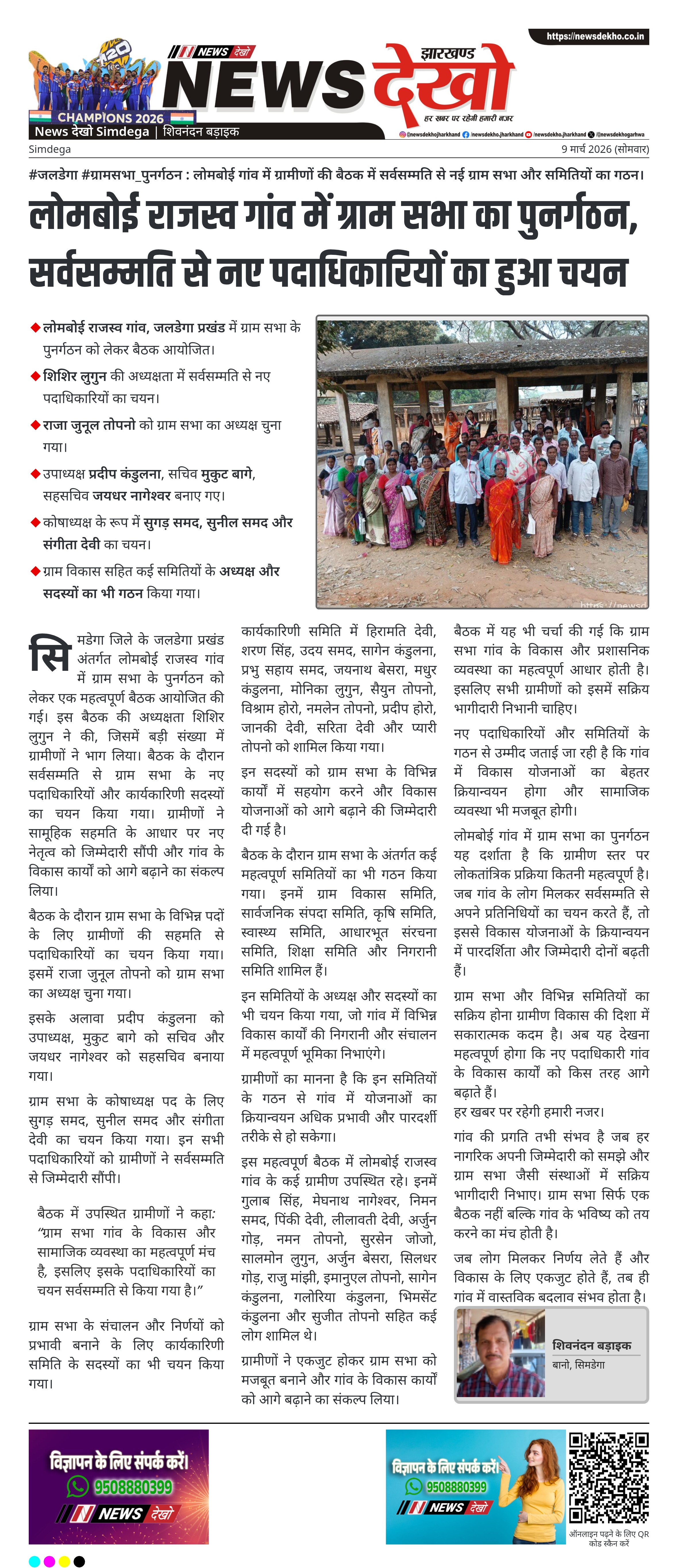 सिमडेगा जिले के जलडेगा प्रखंड अंतर्गत लोमबोई राजस्व गांव में ग्राम सभा के पुनर्गठन को लेकर एक महत्वपूर्ण बैठक आयोजित की गई। इस बैठक की अध्यक्षता शिशिर लुगुन ने की, जिसमें बड़ी संख्या में ग्रामीणों ने भाग लिया। बैठक के दौरान सर्वसम्मति से ग्राम सभा के नए पदाधिकारियों और कार्यकारिणी सदस्यों का चयन किया गया। ग्रामीणों ने सामूहिक सहमति के आधार पर नए नेतृत्व को जिम्मेदारी सौंपी और गांव के विकास कार्यों को आगे बढ़ाने का संकल्प लिया।