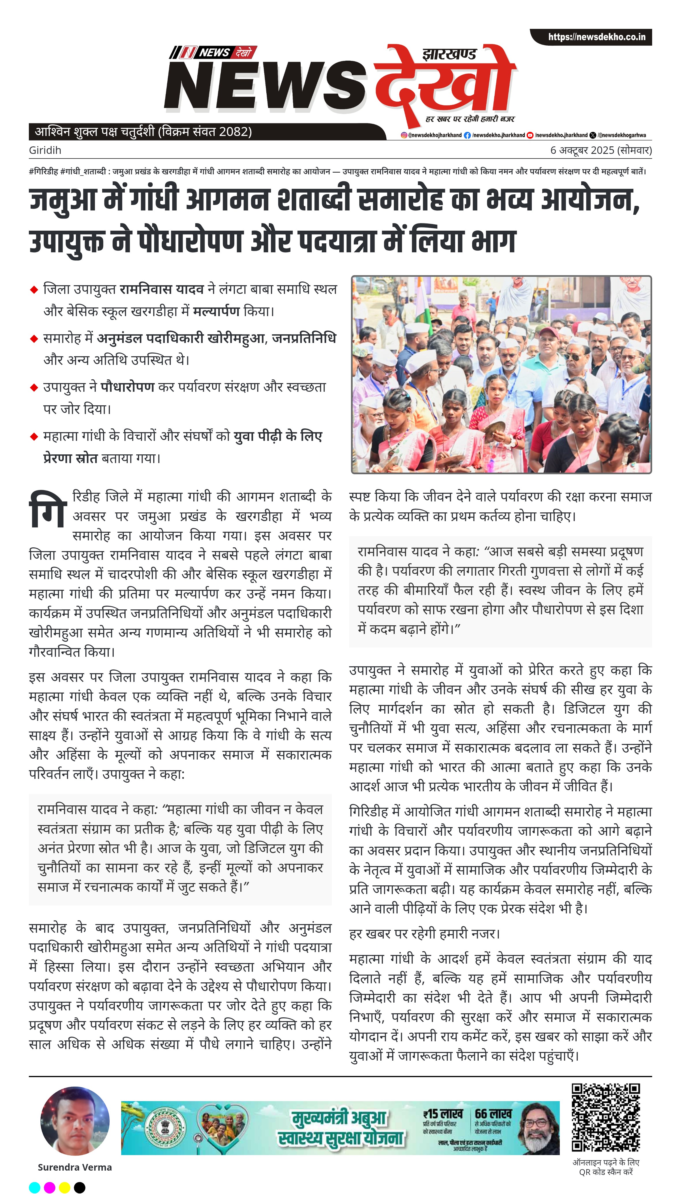 #गिरिडीह #गांधी_शताब्दी : जमुआ प्रखंड के खरगडीहा में गांधी आगमन शताब्दी समारोह का आयोजन — उपायुक्त रामनिवास यादव ने महात्मा गांधी को किया नमन और पर्यावरण संरक्षण पर दी महत्वपूर्ण बातें।