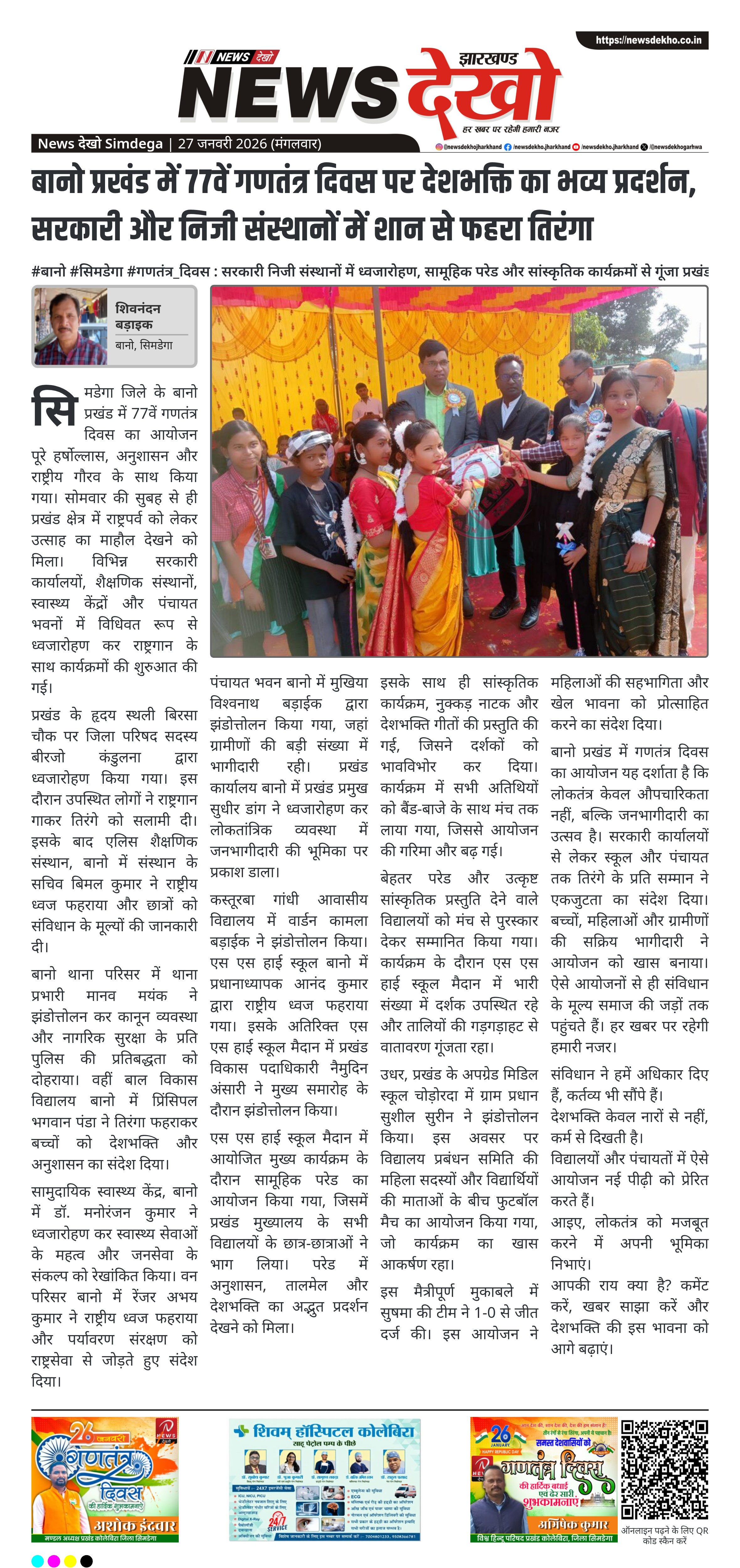 सिमडेगा जिले के बानो प्रखंड में 77वें गणतंत्र दिवस का आयोजन पूरे हर्षोल्लास, अनुशासन और राष्ट्रीय गौरव के साथ किया गया। सोमवार की सुबह से ही प्रखंड क्षेत्र में राष्ट्रपर्व को लेकर उत्साह का माहौल देखने को मिला। विभिन्न सरकारी कार्यालयों, शैक्षणिक संस्थानों, स्वास्थ्य केंद्रों और पंचायत भवनों में विधिवत रूप से ध्वजारोहण कर राष्ट्रगान के साथ कार्यक्रमों की शुरुआत की गई।