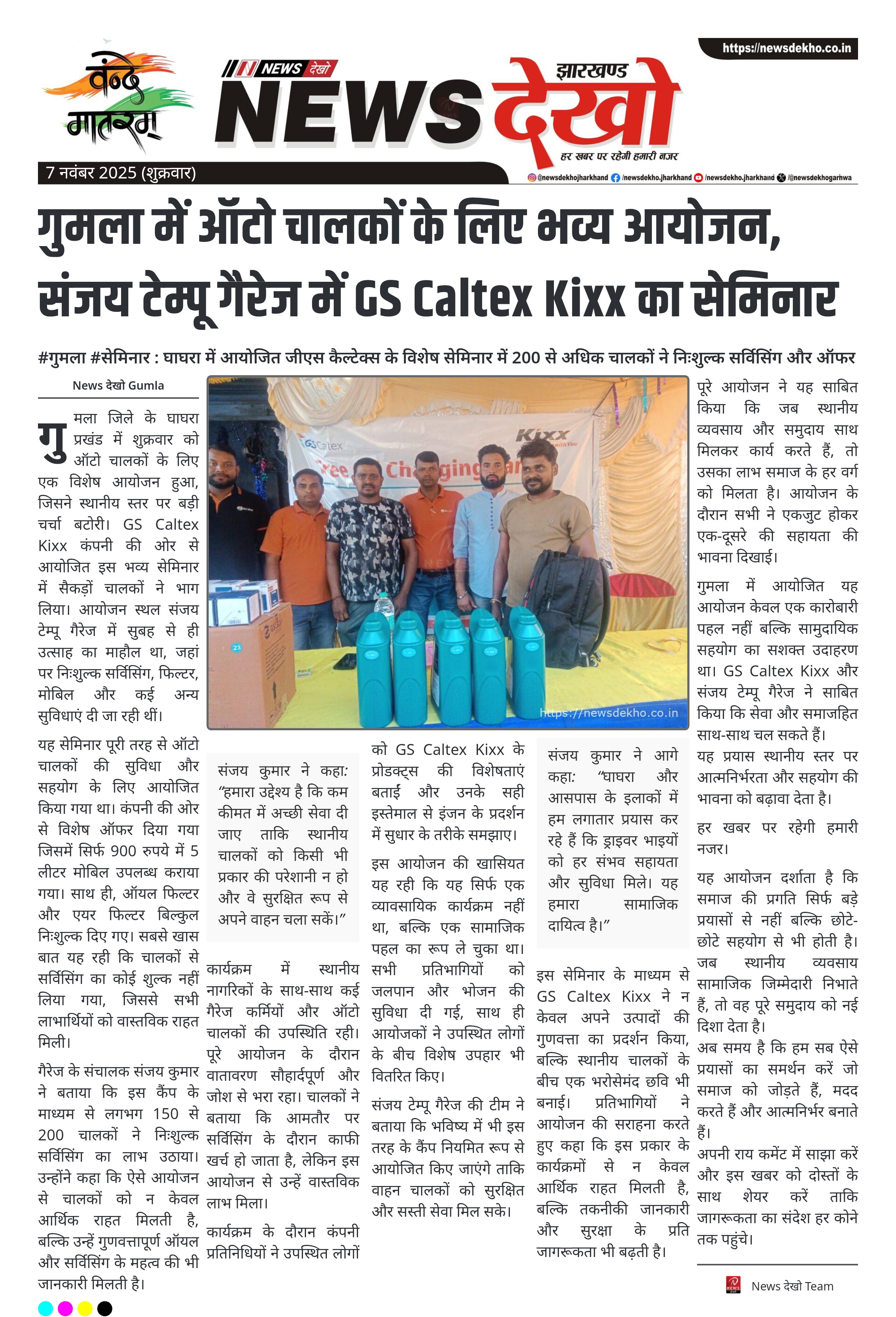 गुमला में आयोजित यह आयोजन केवल एक कारोबारी पहल नहीं बल्कि सामुदायिक सहयोग का सशक्त उदाहरण था। GS Caltex Kixx और संजय टेम्पू गैरेज ने साबित किया कि सेवा और समाजहित साथ-साथ चल सकते हैं।