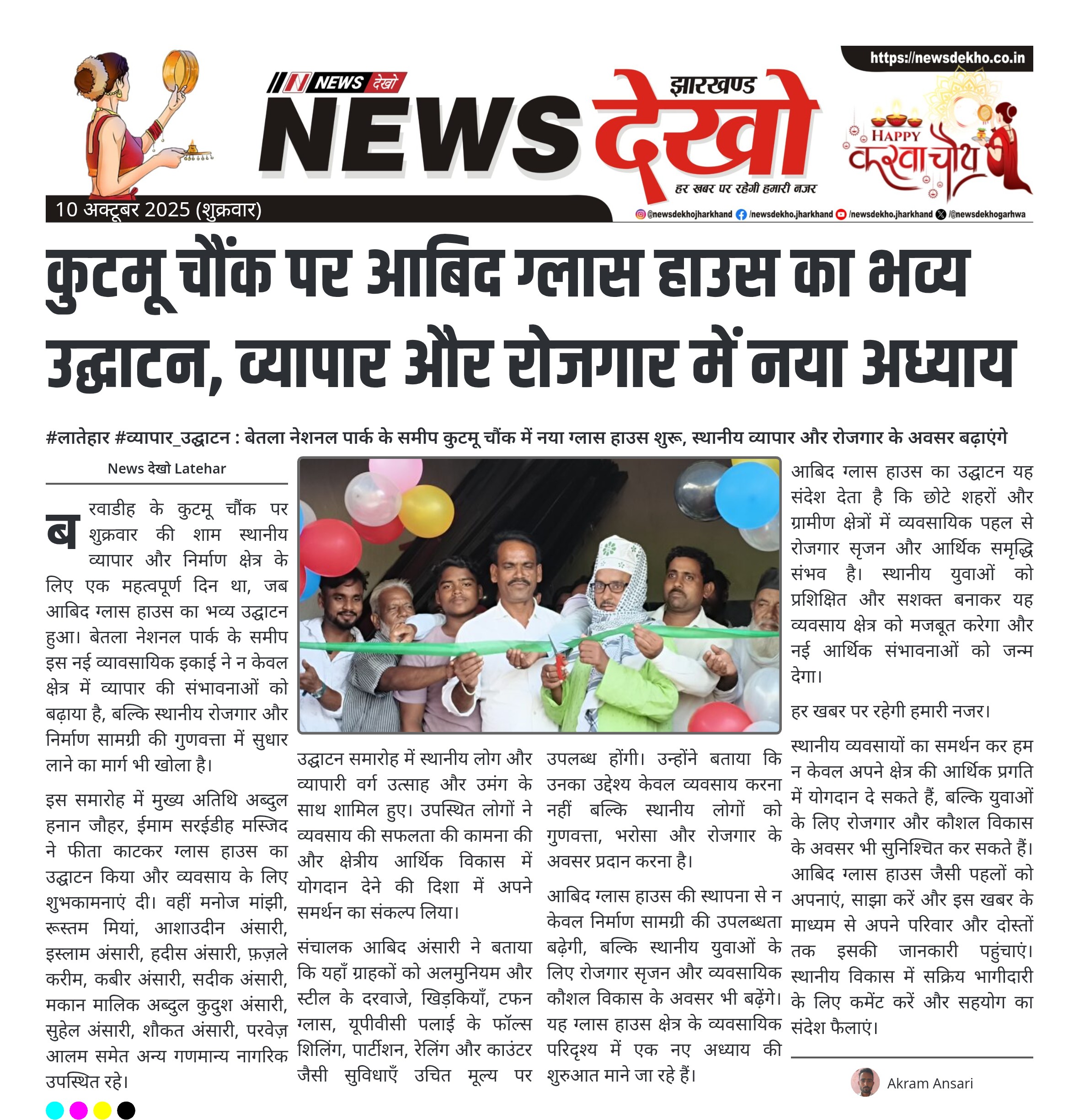 बरवाडीह के कुटमू चौंक पर शुक्रवार की शाम स्थानीय व्यापार और निर्माण क्षेत्र के लिए एक महत्वपूर्ण दिन था, जब आबिद ग्लास हाउस का भव्य उद्घाटन हुआ। बेतला नेशनल पार्क के समीप इस नई व्यावसायिक इकाई ने न केवल क्षेत्र में व्यापार की संभावनाओं को बढ़ाया है, बल्कि स्थानीय रोजगार और निर्माण सामग्री की गुणवत्ता में सुधार लाने का मार्ग भी खोला है।
