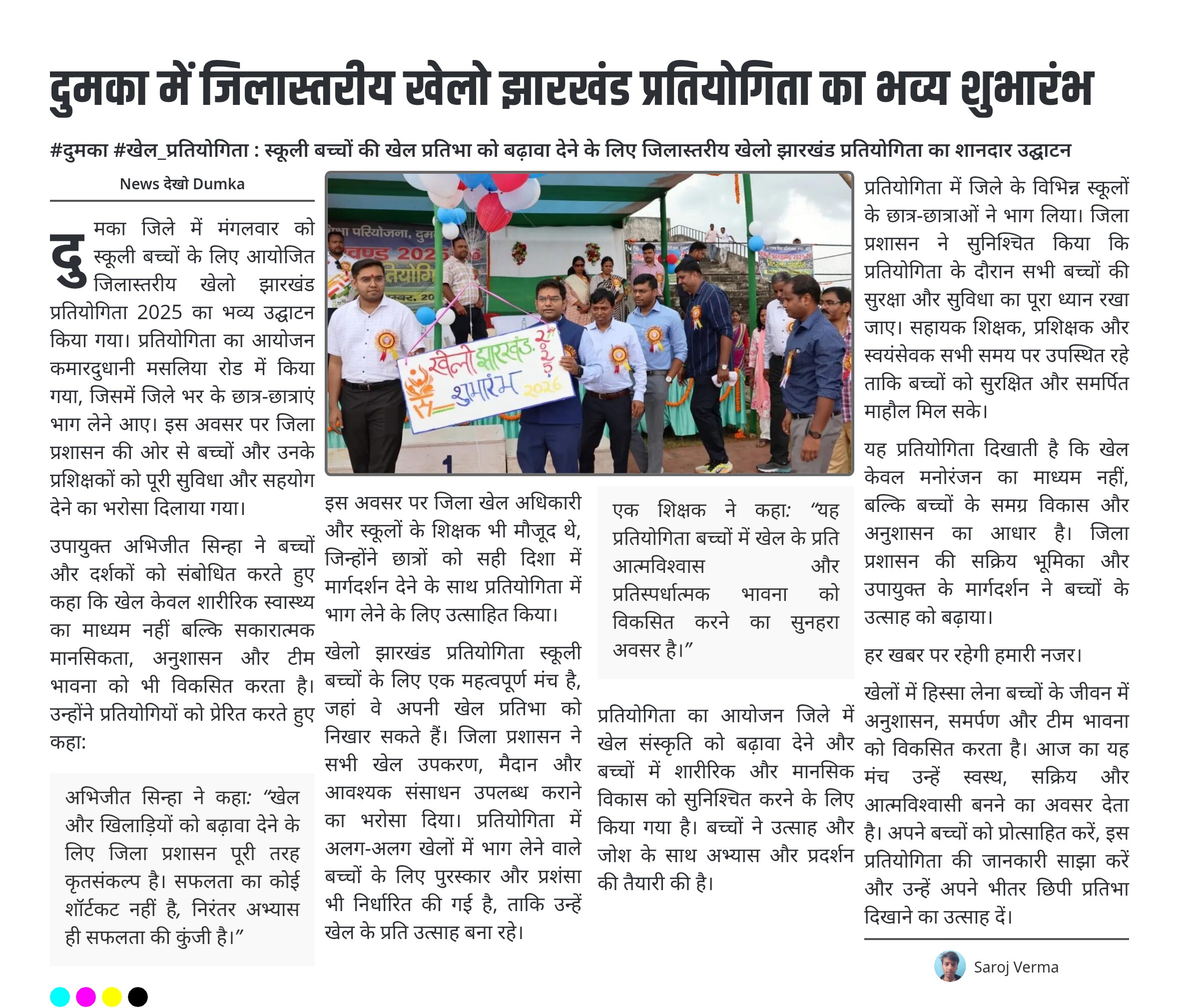 उपायुक्त अभिजीत सिन्हा ने बच्चों और दर्शकों को संबोधित करते हुए कहा कि खेल केवल शारीरिक स्वास्थ्य का माध्यम नहीं बल्कि सकारात्मक मानसिकता, अनुशासन और टीम भावना को भी विकसित करता है। उन्होंने प्रतियोगियों को प्रेरित करते हुए कहा: