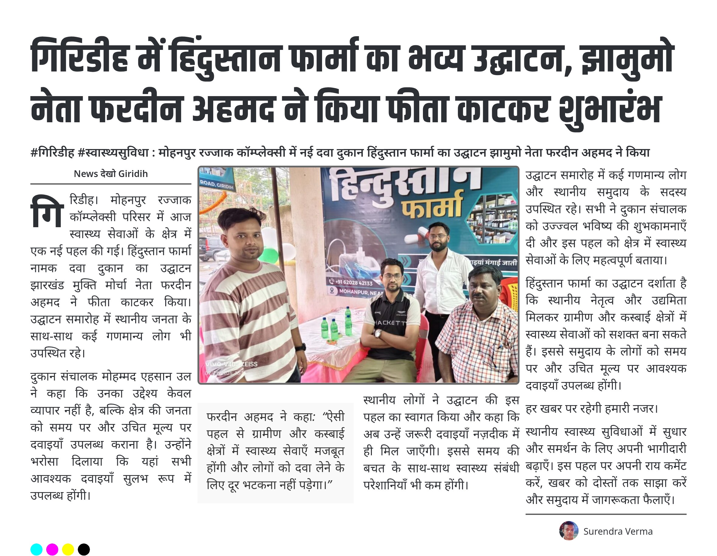 गिरिडीह में हिंदुस्तान फार्मा का भव्य उद्घाटन, झामुमो नेता फरदीन अहमद ने किया फीता काटकर शुभारंभ