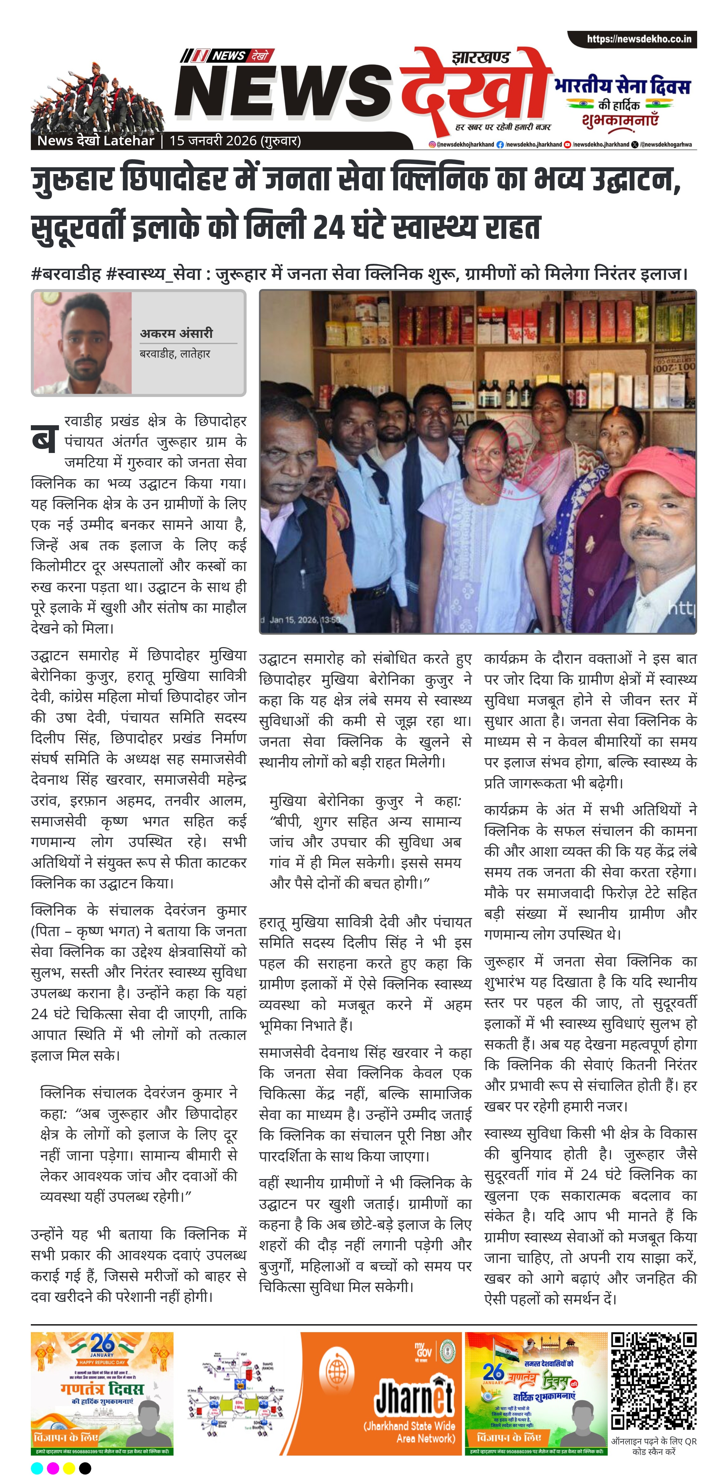 लातेहार जिले के बरवाडीह प्रखंड अंतर्गत छिपादोहर पंचायत के जुरूहार गांव में जनता सेवा क्लिनिक का विधिवत उद्घाटन किया गया। सुदूरवर्ती क्षेत्र में 24 घंटे स्वास्थ्य सुविधा उपलब्ध कराने के उद्देश्य से शुरू यह क्लिनिक स्थानीय ग्रामीणों के लिए बड़ी राहत साबित होगा। उद्घाटन समारोह में कई जनप्रतिनिधि, समाजसेवी और ग्रामीण उपस्थित रहे। इस पहल से इलाज के लिए दूर शहरों पर निर्भरता कम होने की उम्मीद है।