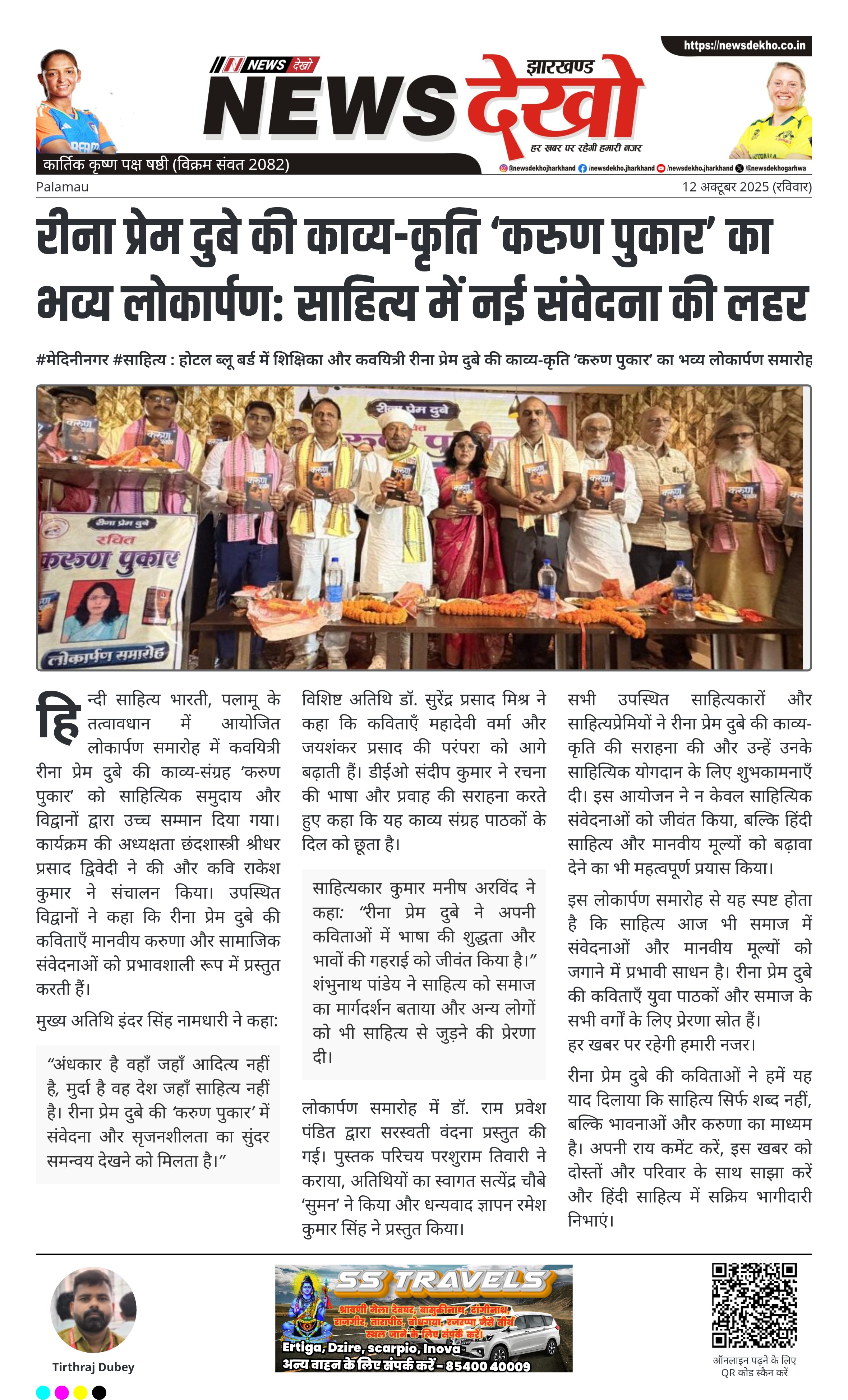 हिन्दी साहित्य भारती, पलामू के तत्वावधान में आयोजित लोकार्पण समारोह में कवयित्री रीना प्रेम दुबे की काव्य-संग्रह ‘करुण पुकार’ को साहित्यिक समुदाय और विद्वानों द्वारा उच्च सम्मान दिया गया। कार्यक्रम की अध्यक्षता छंदशास्त्री श्रीधर प्रसाद द्विवेदी ने की और कवि राकेश कुमार ने संचालन किया। उपस्थित विद्वानों ने कहा कि रीना प्रेम दुबे की कविताएँ मानवीय करुणा और सामाजिक संवेदनाओं को प्रभावशाली रूप में प्रस्तुत करती हैं।