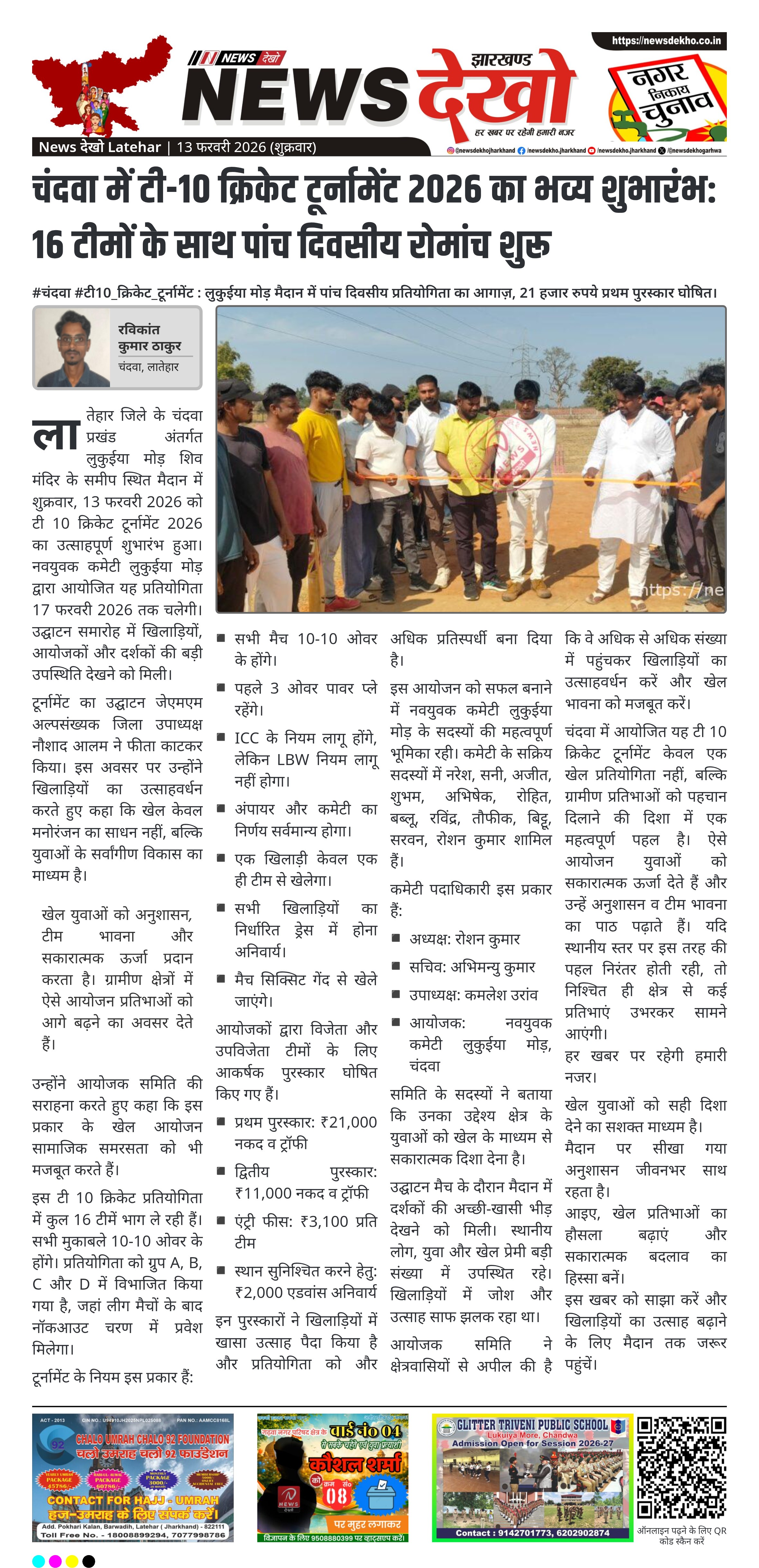 लातेहार जिले के चंदवा प्रखंड अंतर्गत लुकुईया मोड़ शिव मंदिर के समीप स्थित मैदान में शुक्रवार, 13 फरवरी 2026 को टी 10 क्रिकेट टूर्नामेंट 2026 का उत्साहपूर्ण शुभारंभ हुआ। नवयुवक कमेटी लुकुईया मोड़ द्वारा आयोजित यह प्रतियोगिता 17 फरवरी 2026 तक चलेगी। उद्घाटन समारोह में खिलाड़ियों, आयोजकों और दर्शकों की बड़ी उपस्थिति देखने को मिली।