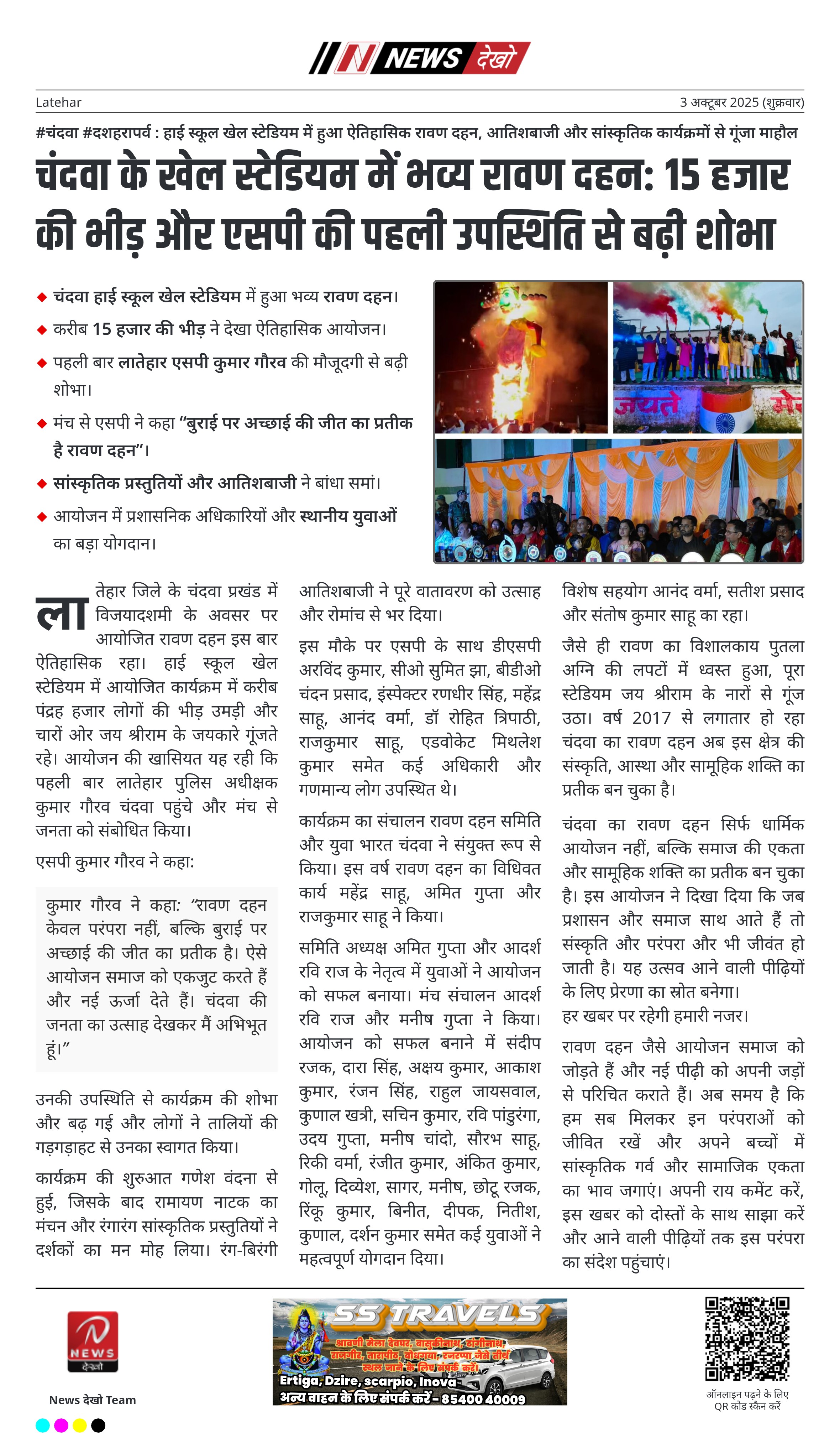 लातेहार जिले के चंदवा प्रखंड में विजयादशमी के अवसर पर आयोजित रावण दहन इस बार ऐतिहासिक रहा। हाई स्कूल खेल स्टेडियम में आयोजित कार्यक्रम में करीब पंद्रह हजार लोगों की भीड़ उमड़ी और चारों ओर जय श्रीराम के जयकारे गूंजते रहे। आयोजन की खासियत यह रही कि पहली बार लातेहार पुलिस अधीक्षक कुमार गौरव चंदवा पहुंचे और मंच से जनता को संबोधित किया।