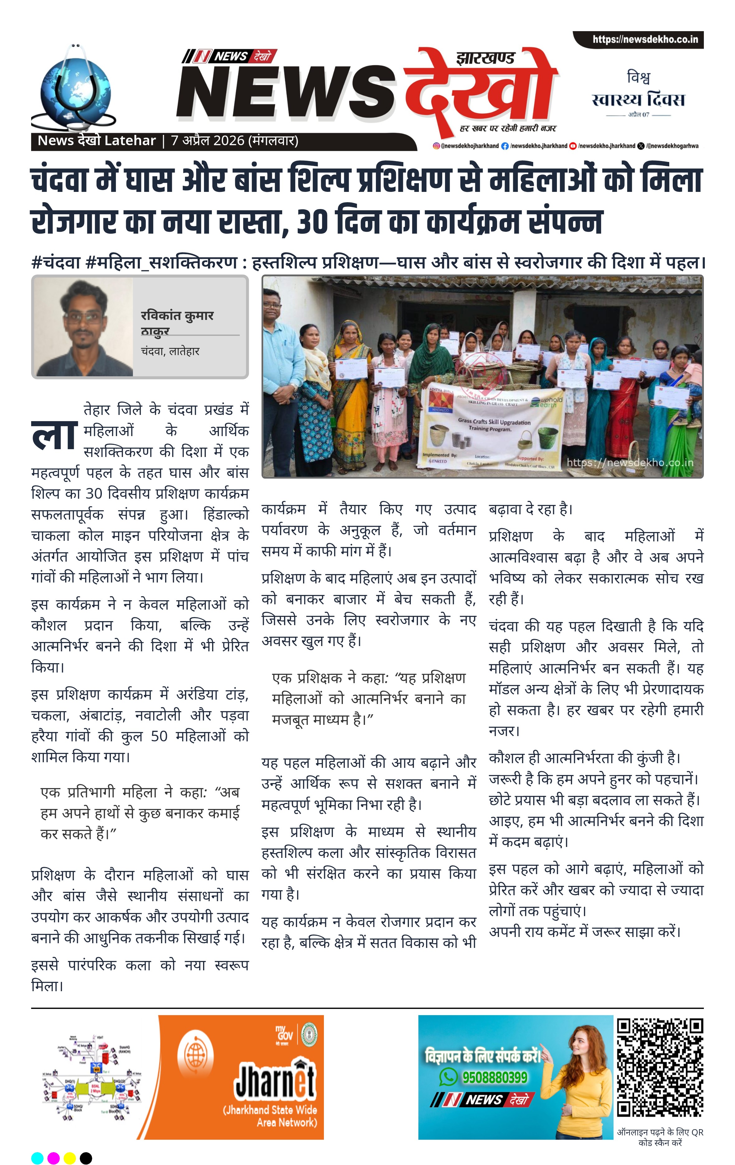 लातेहार जिले के चंदवा प्रखंड में महिलाओं के आर्थिक सशक्तिकरण की दिशा में एक महत्वपूर्ण पहल के तहत घास और बांस शिल्प का 30 दिवसीय प्रशिक्षण कार्यक्रम सफलतापूर्वक संपन्न हुआ। हिंडाल्को चाकला कोल माइन परियोजना क्षेत्र के अंतर्गत आयोजित इस प्रशिक्षण में पांच गांवों की महिलाओं ने भाग लिया।