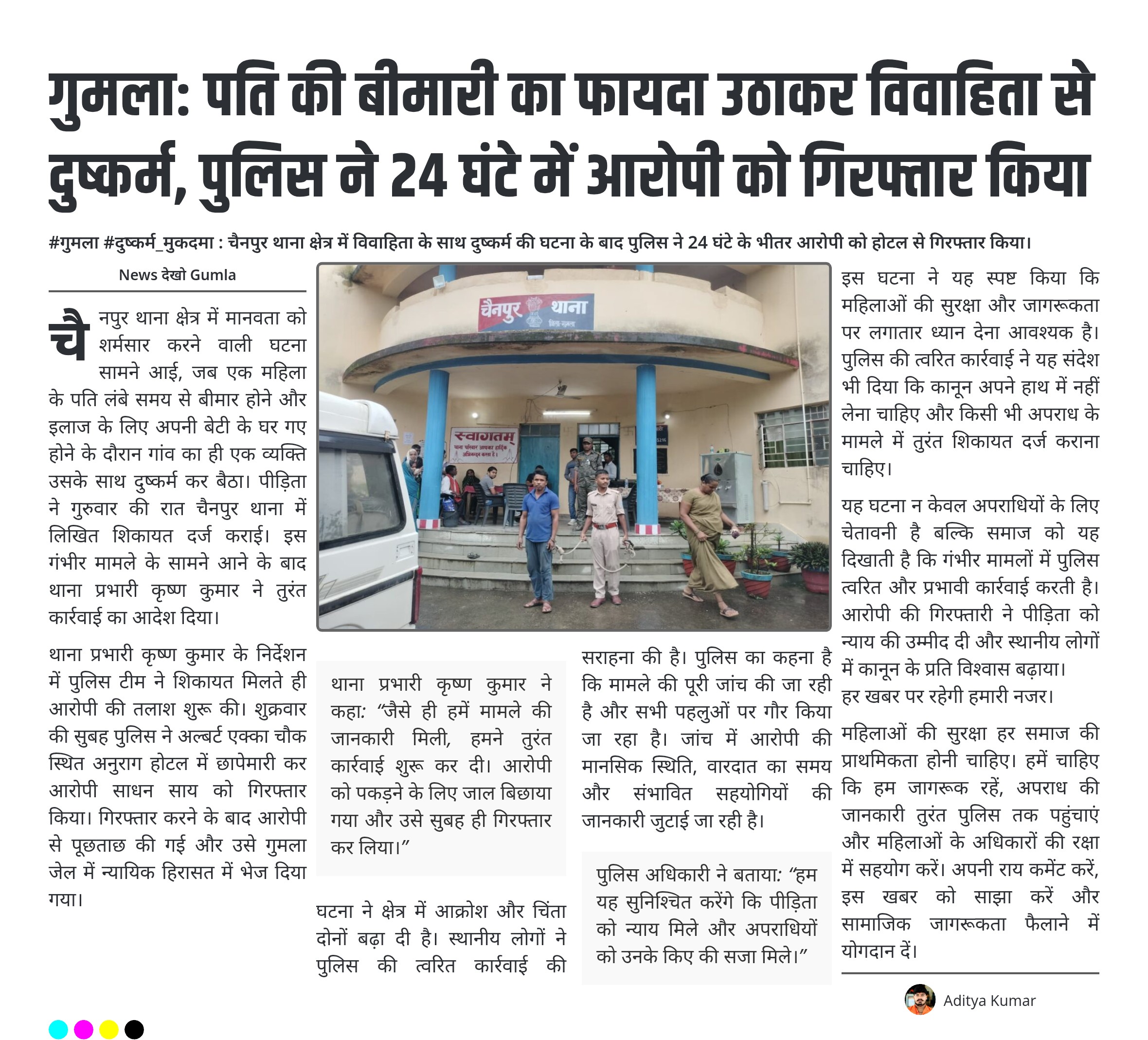 #गुमला #दुष्कर्म_मुकदमा : चैनपुर थाना क्षेत्र में विवाहिता के साथ दुष्कर्म की घटना के बाद पुलिस ने 24 घंटे के भीतर आरोपी को होटल से गिरफ्तार किया।