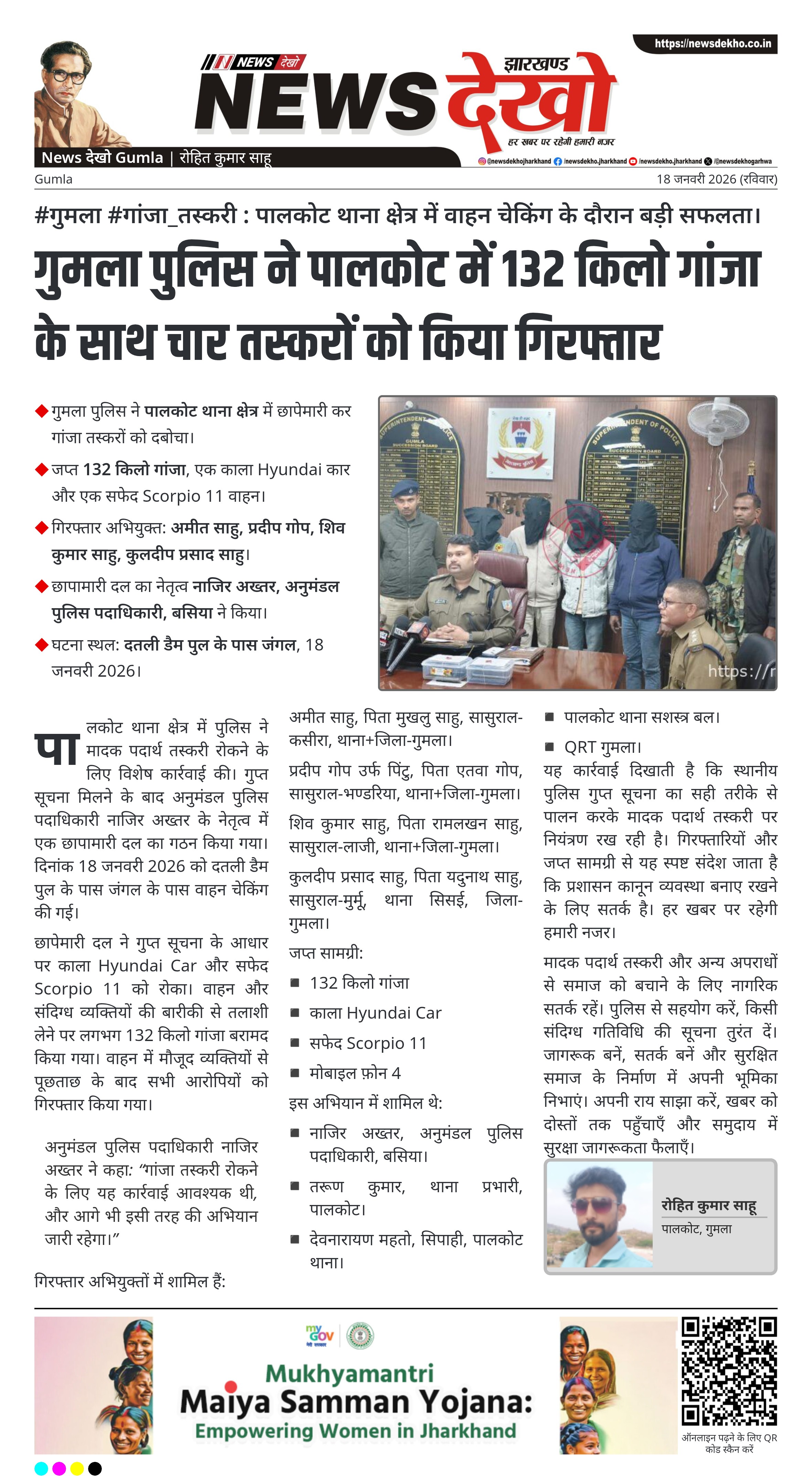 गुमला जिले के पालकोट थाना क्षेत्र में पुलिस ने 18 जनवरी 2026 को दो वाहनों में 132 किलो गांजा के साथ चार तस्करों को गिरफ्तार किया। इस छापेमारी का नेतृत्व अनुमंडल पुलिस पदाधिकारी बसिया, नाजिर अख्तर ने किया। कार्रवाई में Hyundai और Scorpio वाहन भी जप्त किए गए। यह तस्करी रोकने में स्थानीय पुलिस के सक्रियता और गुप्त सूचना की सफलता महत्वपूर्ण रही।