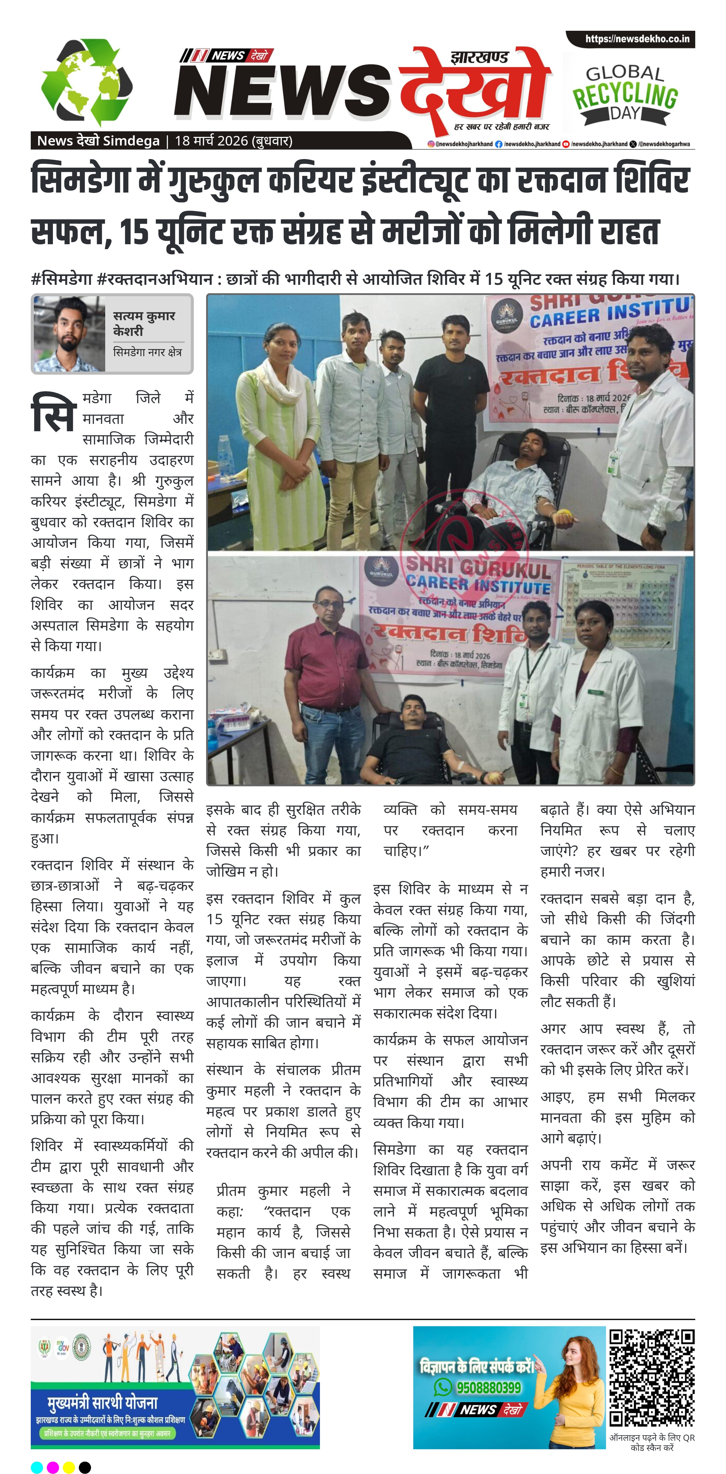 - श्री गुरुकुल करियर इंस्टीट्यूट, सिमडेगा में रक्तदान शिविर आयोजित।