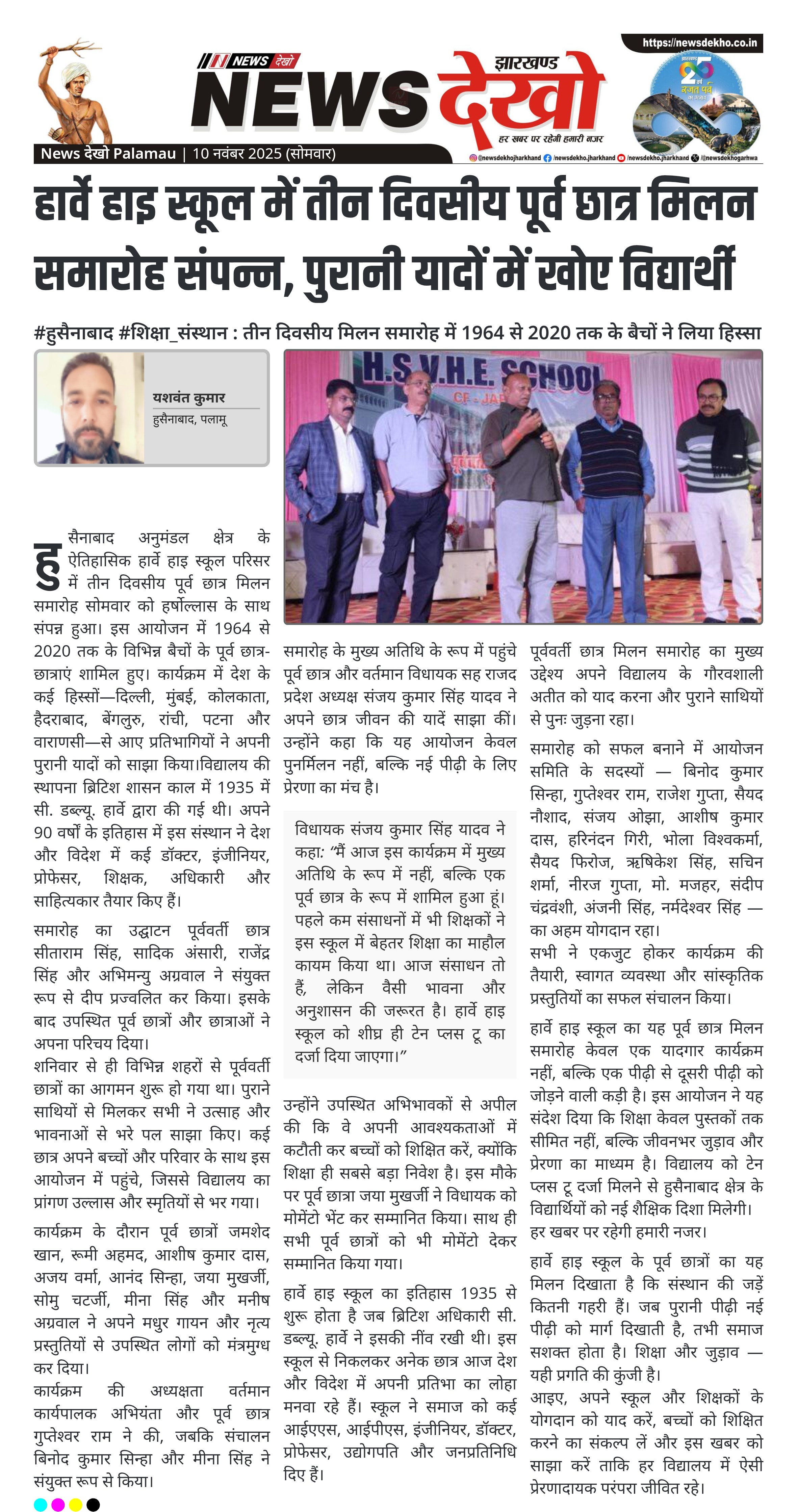हुसैनाबाद अनुमंडल क्षेत्र के ऐतिहासिक हार्वे हाइ स्कूल परिसर में तीन दिवसीय पूर्व छात्र मिलन समारोह सोमवार को हर्षोल्लास के साथ संपन्न हुआ। इस आयोजन में 1964 से 2020 तक के विभिन्न बैचों के पूर्व छात्र-छात्राएं शामिल हुए। कार्यक्रम में देश के कई हिस्सों—दिल्ली, मुंबई, कोलकाता, हैदराबाद, बेंगलुरु, रांची, पटना और वाराणसी—से आए प्रतिभागियों ने अपनी पुरानी यादों को साझा किया।