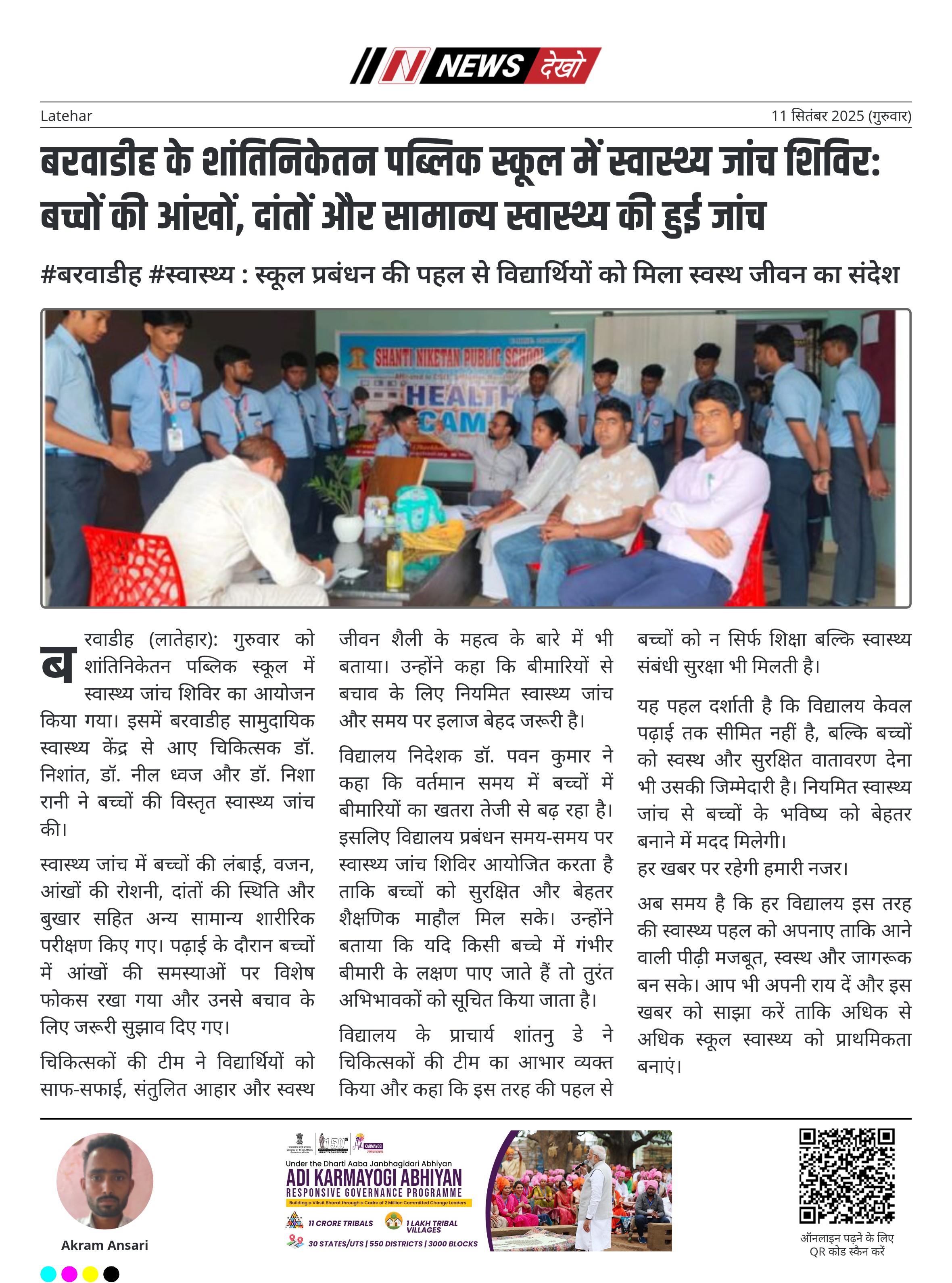 बरवाडीह के शांतिनिकेतन पब्लिक स्कूल में स्वास्थ्य जांच शिविर: बच्चों की आंखों, दांतों और सामान्य स्वास्थ्य की हुई जांच