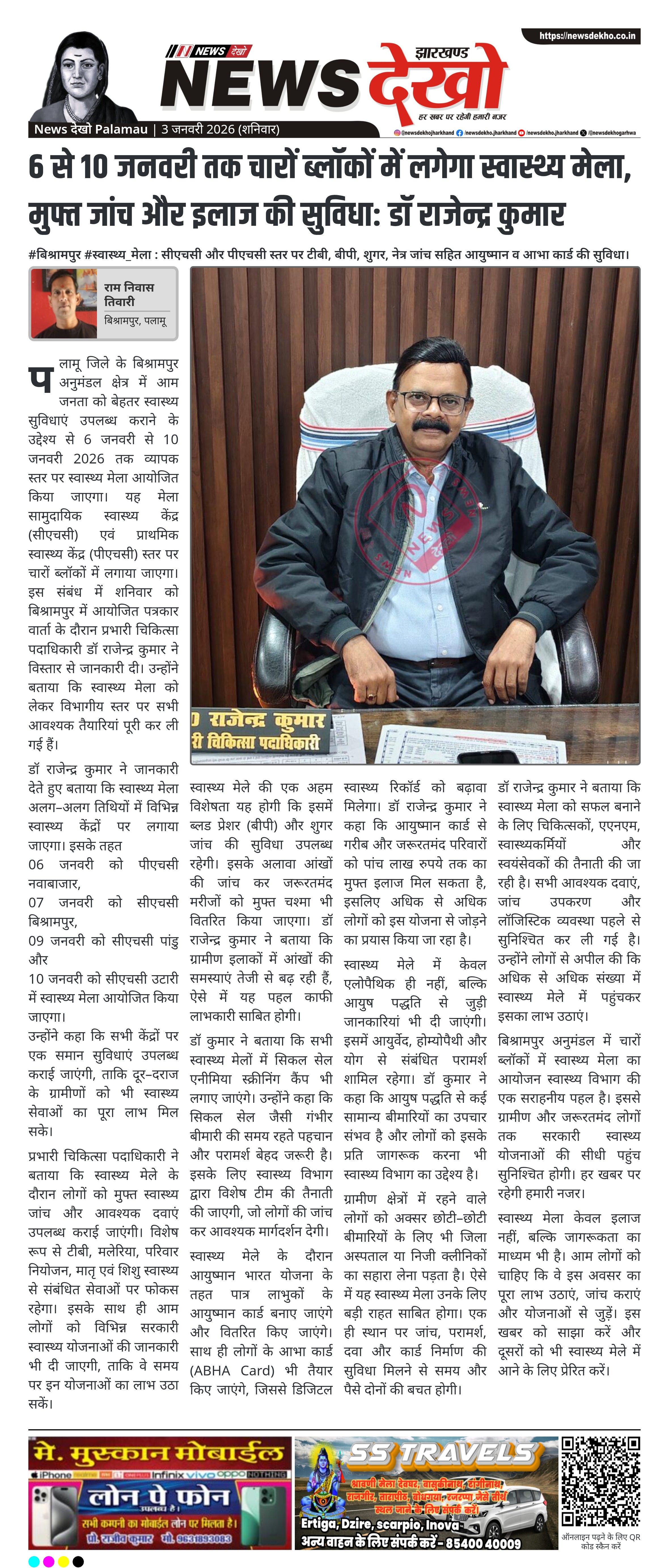 बिश्रामपुर अनुमंडल में चारों ब्लॉकों में स्वास्थ्य मेला का आयोजन स्वास्थ्य विभाग की एक सराहनीय पहल है। इससे ग्रामीण और जरूरतमंद लोगों तक सरकारी स्वास्थ्य योजनाओं की सीधी पहुंच सुनिश्चित होगी। हर खबर पर रहेगी हमारी नजर।