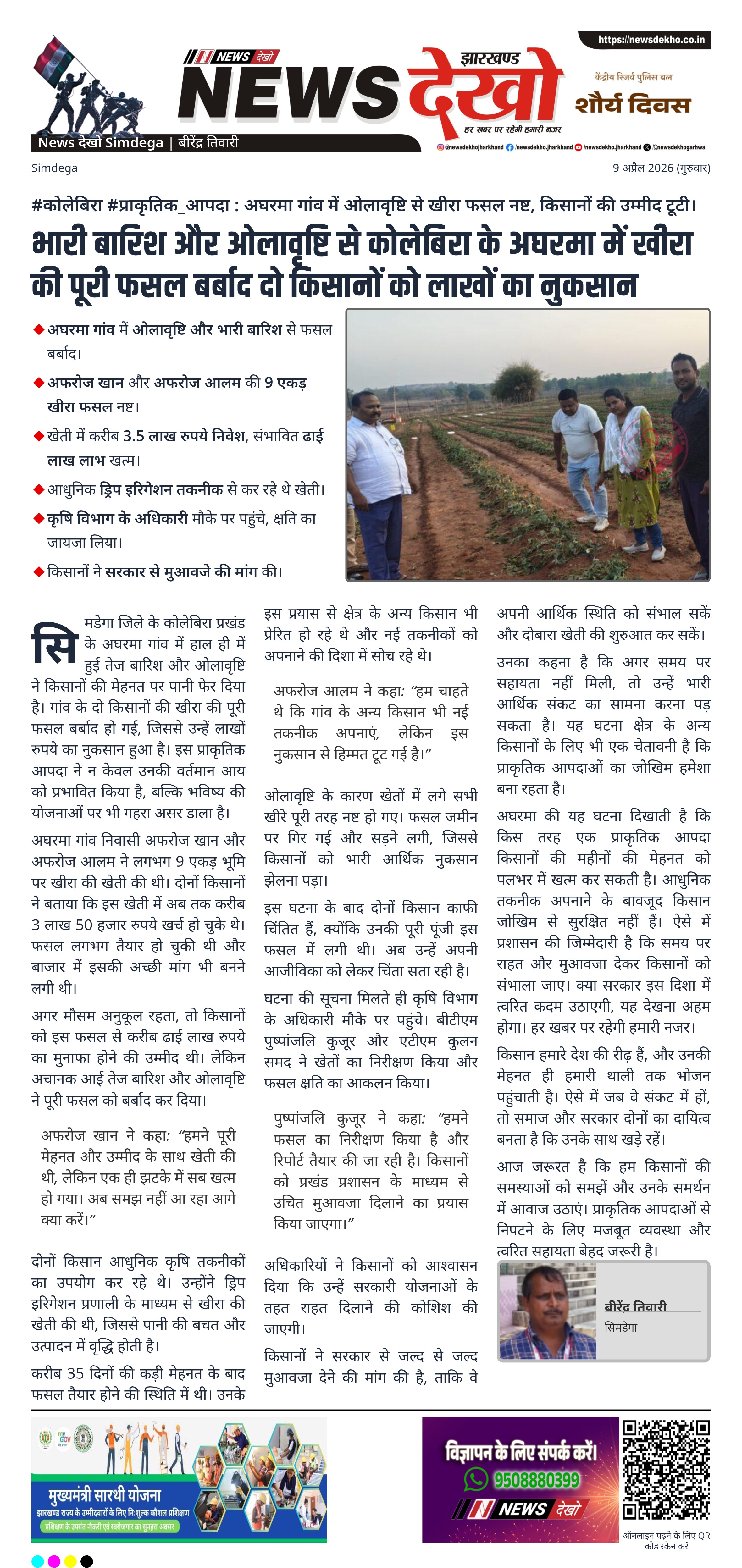 सिमडेगा जिले के कोलेबिरा प्रखंड अंतर्गत अघरमा गांव में भारी बारिश और ओलावृष्टि से खीरा की फसल पूरी तरह नष्ट हो गई। किसान अफरोज खान और अफरोज आलम की लगभग 9 एकड़ में लगी फसल बर्बाद हो गई, जिससे लाखों रुपये का नुकसान हुआ। कृषि विभाग ने मौके पर पहुंचकर क्षति का आकलन किया और मुआवजे का आश्वासन दिया।