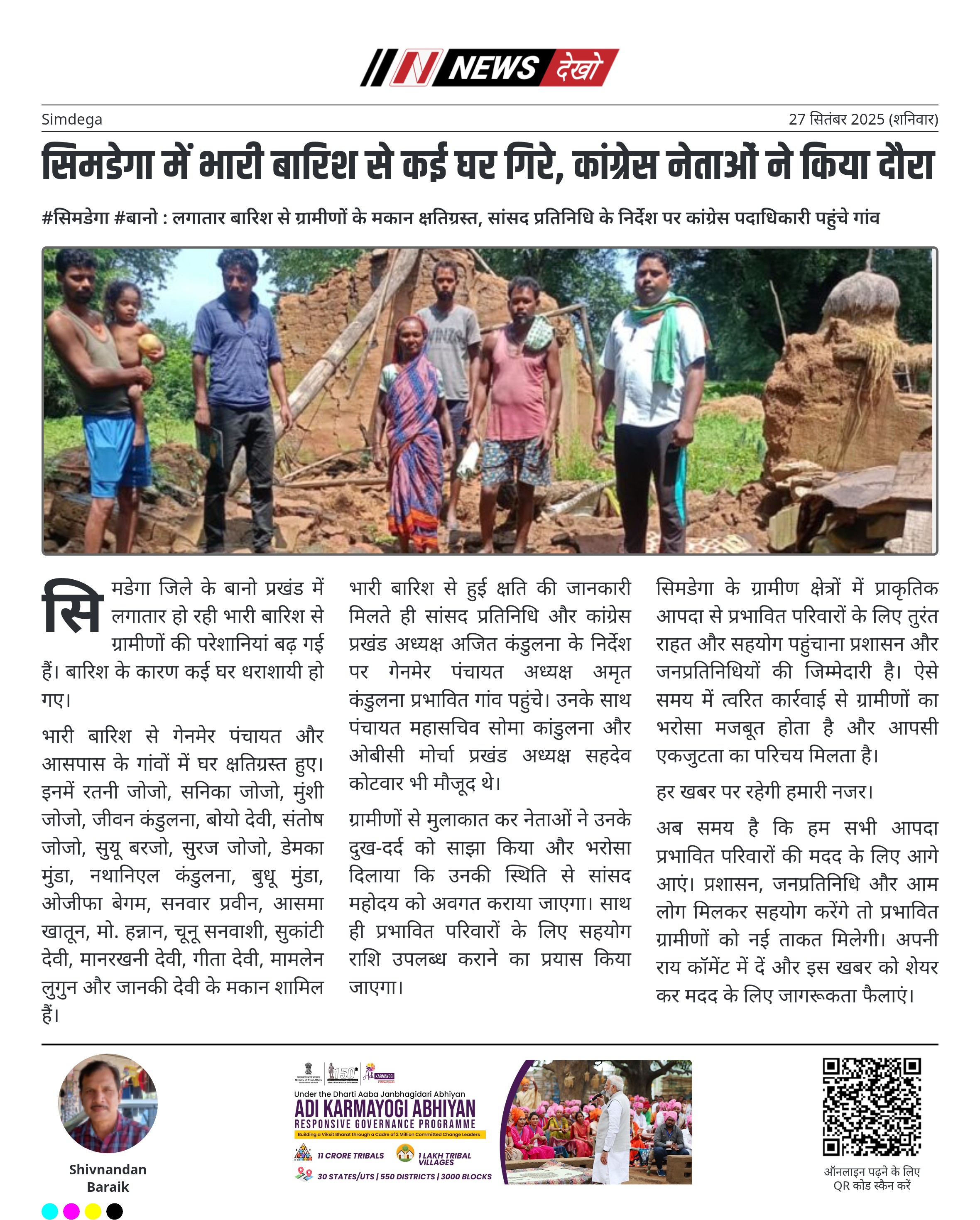 #सिमडेगा #बानो : लगातार बारिश से ग्रामीणों के मकान क्षतिग्रस्त, सांसद प्रतिनिधि के निर्देश पर कांग्रेस पदाधिकारी पहुंचे गांव