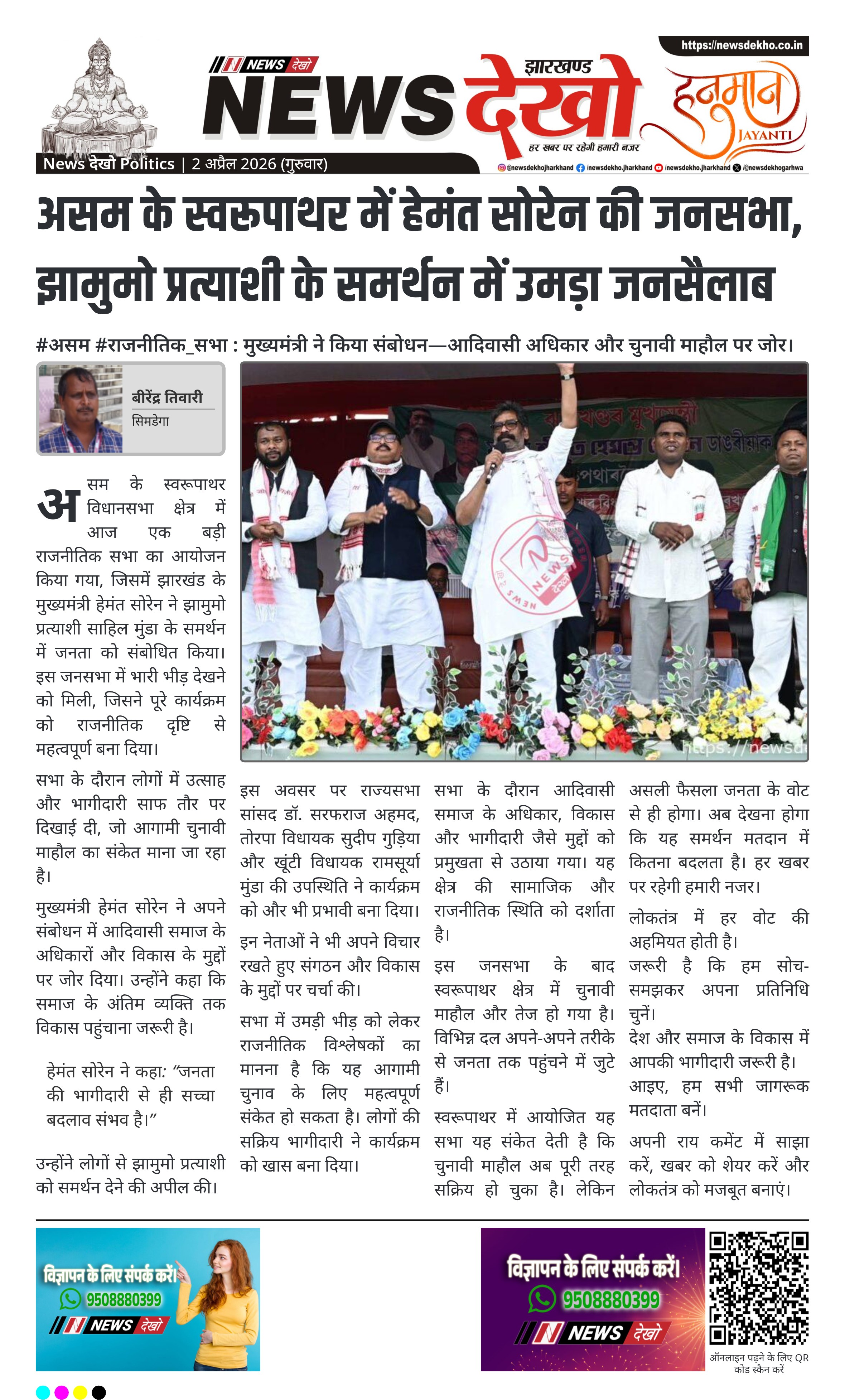 असम के स्वरूपाथर विधानसभा क्षेत्र में आज एक बड़ी राजनीतिक सभा का आयोजन किया गया, जिसमें झारखंड के मुख्यमंत्री हेमंत सोरेन ने झामुमो प्रत्याशी साहिल मुंडा के समर्थन में जनता को संबोधित किया। इस जनसभा में भारी भीड़ देखने को मिली, जिसने पूरे कार्यक्रम को राजनीतिक दृष्टि से महत्वपूर्ण बना दिया।