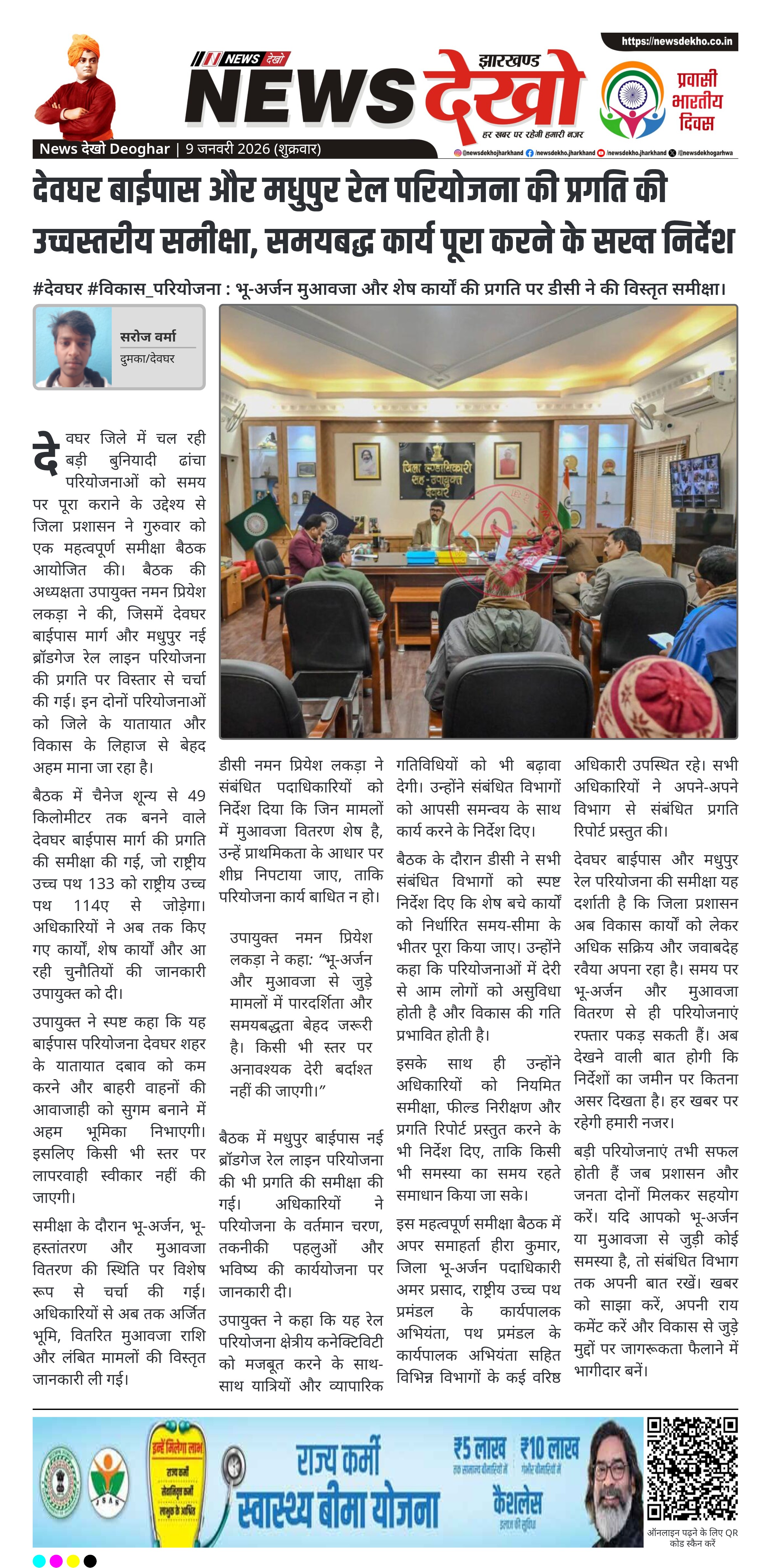 देवघर में राष्ट्रीय महत्व की बुनियादी ढांचा परियोजनाओं की प्रगति को लेकर जिला प्रशासन ने सख्ती दिखाई है। उपायुक्त की अध्यक्षता में आयोजित समीक्षा बैठक में देवघर बाईपास और मधुपुर नई रेल लाइन परियोजना की स्थिति पर चर्चा हुई। भू-अर्जन, मुआवजा वितरण और लंबित कार्यों की समीक्षा करते हुए समय-सीमा के भीतर काम पूरा करने के निर्देश दिए गए। इन परियोजनाओं से क्षेत्रीय यातायात और कनेक्टिविटी को बड़ा लाभ मिलने की उम्मीद है।