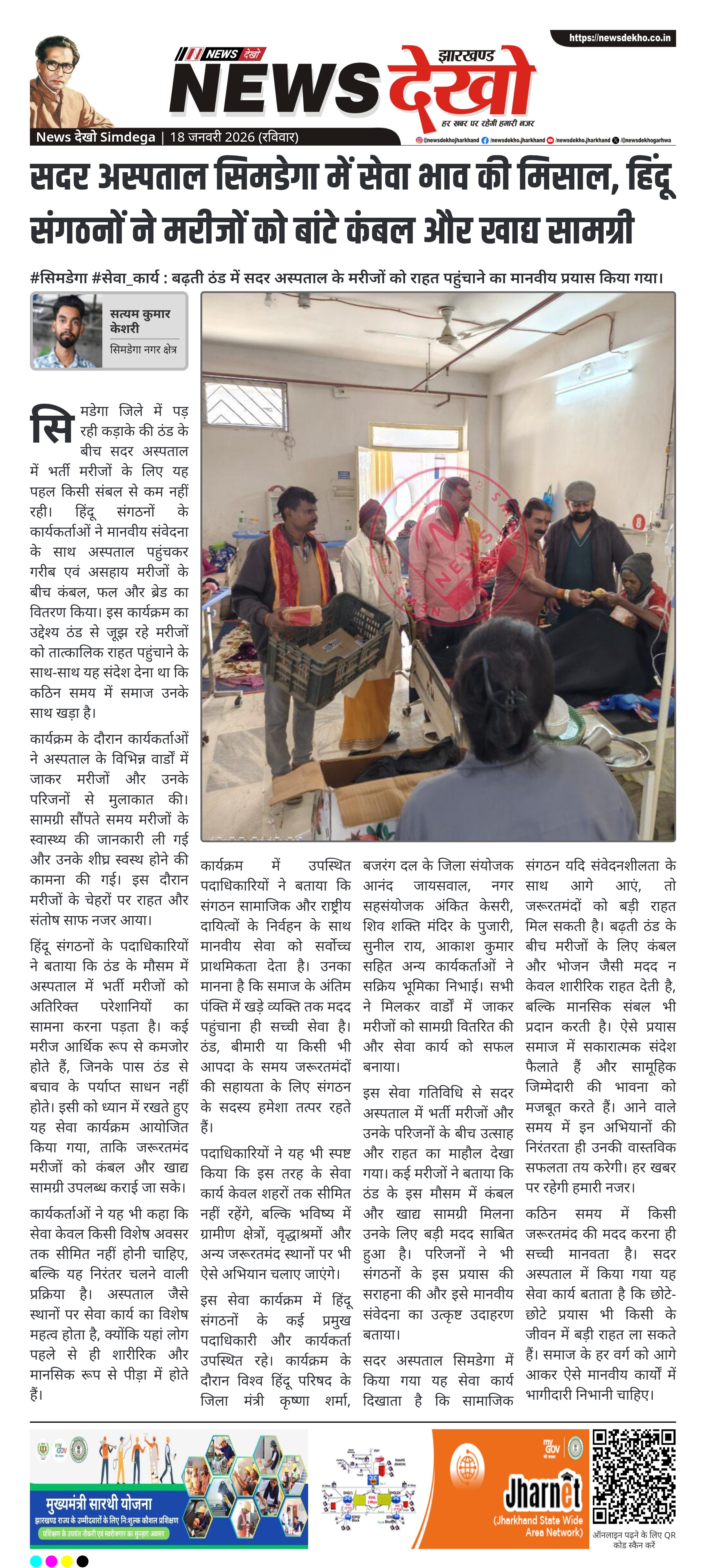 सिमडेगा जिले में पड़ रही कड़ाके की ठंड के बीच सदर अस्पताल में भर्ती मरीजों के लिए यह पहल किसी संबल से कम नहीं रही। हिंदू संगठनों के कार्यकर्ताओं ने मानवीय संवेदना के साथ अस्पताल पहुंचकर गरीब एवं असहाय मरीजों के बीच कंबल, फल और ब्रेड का वितरण किया। इस कार्यक्रम का उद्देश्य ठंड से जूझ रहे मरीजों को तात्कालिक राहत पहुंचाने के साथ-साथ यह संदेश देना था कि कठिन समय में समाज उनके साथ खड़ा है।