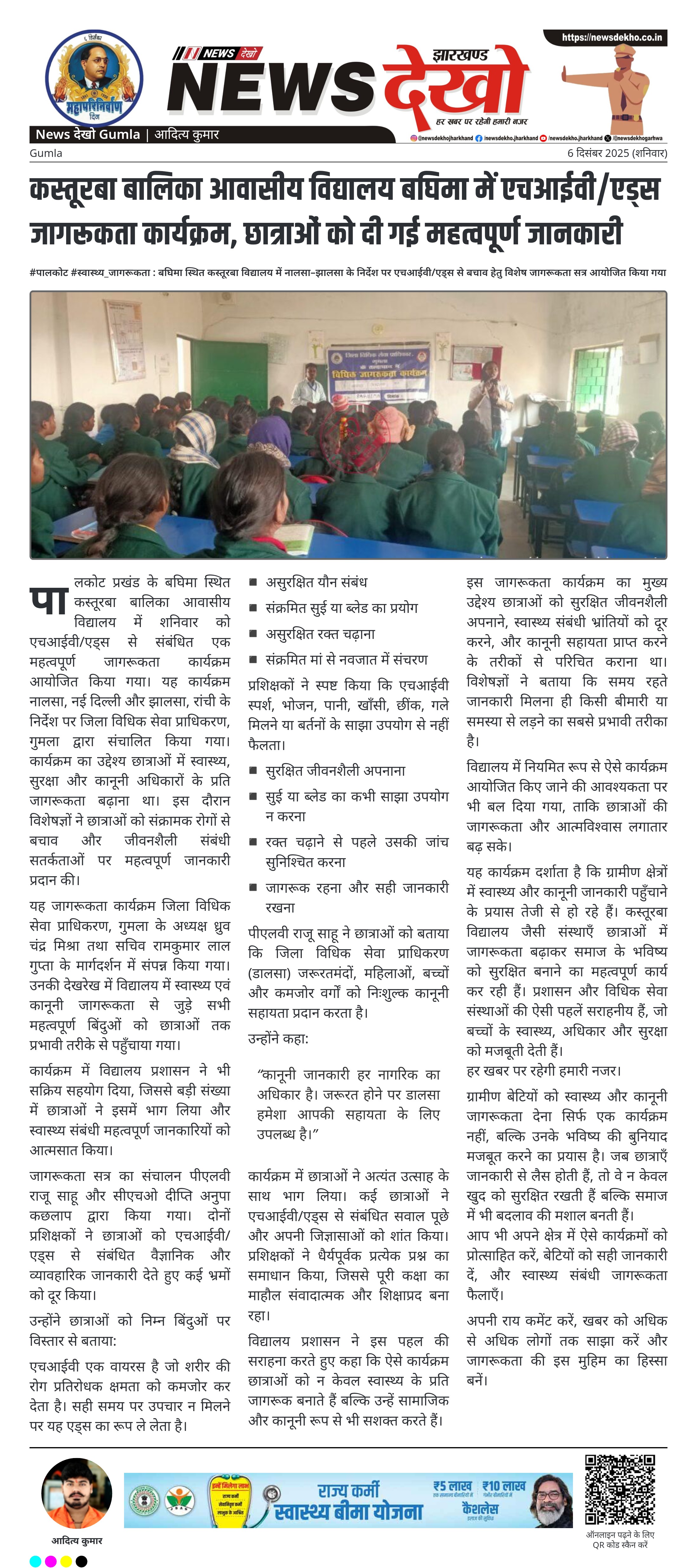 पालकोट प्रखंड के बघिमा स्थित कस्तूरबा बालिका आवासीय विद्यालय में शनिवार को एचआईवी/एड्स से संबंधित एक महत्वपूर्ण जागरूकता कार्यक्रम आयोजित किया गया। यह कार्यक्रम नालसा, नई दिल्ली और झालसा, रांची के निर्देश पर जिला विधिक सेवा प्राधिकरण, गुमला द्वारा संचालित किया गया। कार्यक्रम का उद्देश्य छात्राओं में स्वास्थ्य, सुरक्षा और कानूनी अधिकारों के प्रति जागरूकता बढ़ाना था। इस दौरान विशेषज्ञों ने छात्राओं को संक्रामक रोगों से बचाव और जीवनशैली संबंधी सतर्कताओं पर महत्वपूर्ण जानकारी प्रदान की।