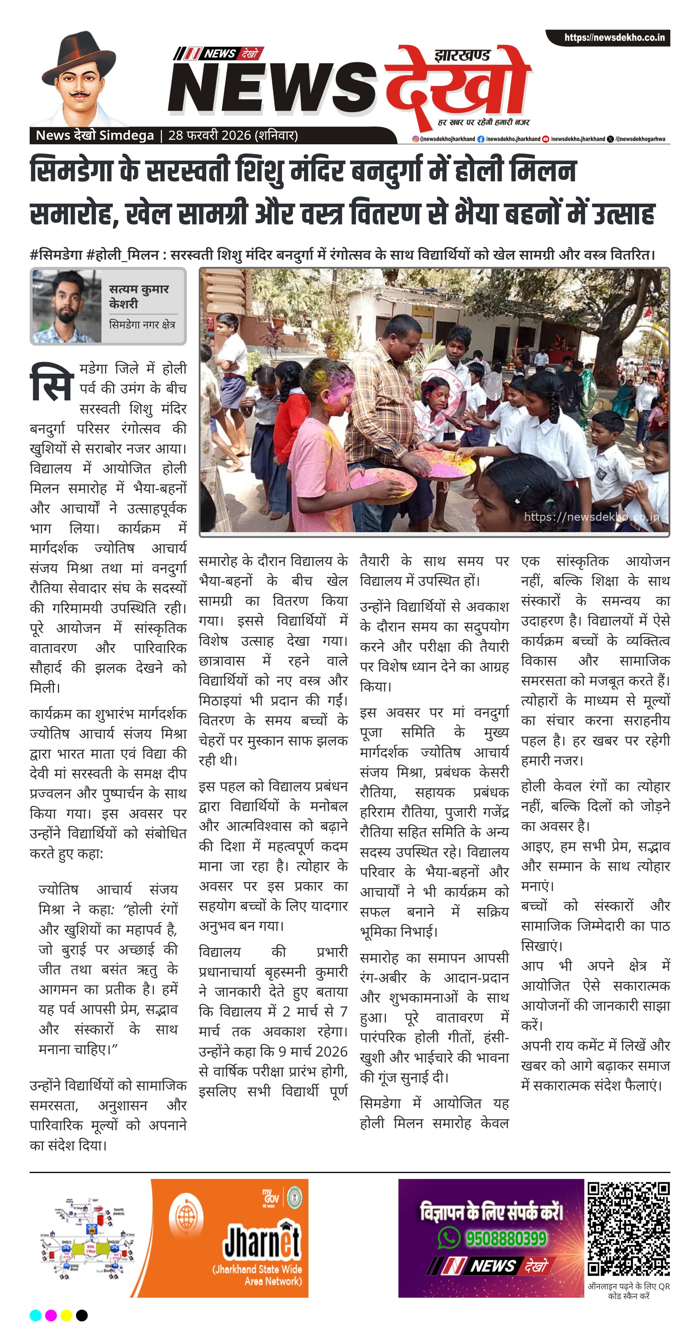 सिमडेगा स्थित सरस्वती शिशु मंदिर बनदुर्गा में होली मिलन समारोह हर्षोल्लास के साथ आयोजित किया गया। कार्यक्रम का शुभारंभ मार्गदर्शक ज्योतिष आचार्य संजय मिश्रा ने दीप प्रज्वलित कर किया। समारोह में विद्यार्थियों के बीच खेल सामग्री, वस्त्र और मिठाइयों का वितरण हुआ। विद्यालय ने 2 से 7 मार्च तक अवकाश और 9 मार्च 2026 से वार्षिक परीक्षा की सूचना दी।