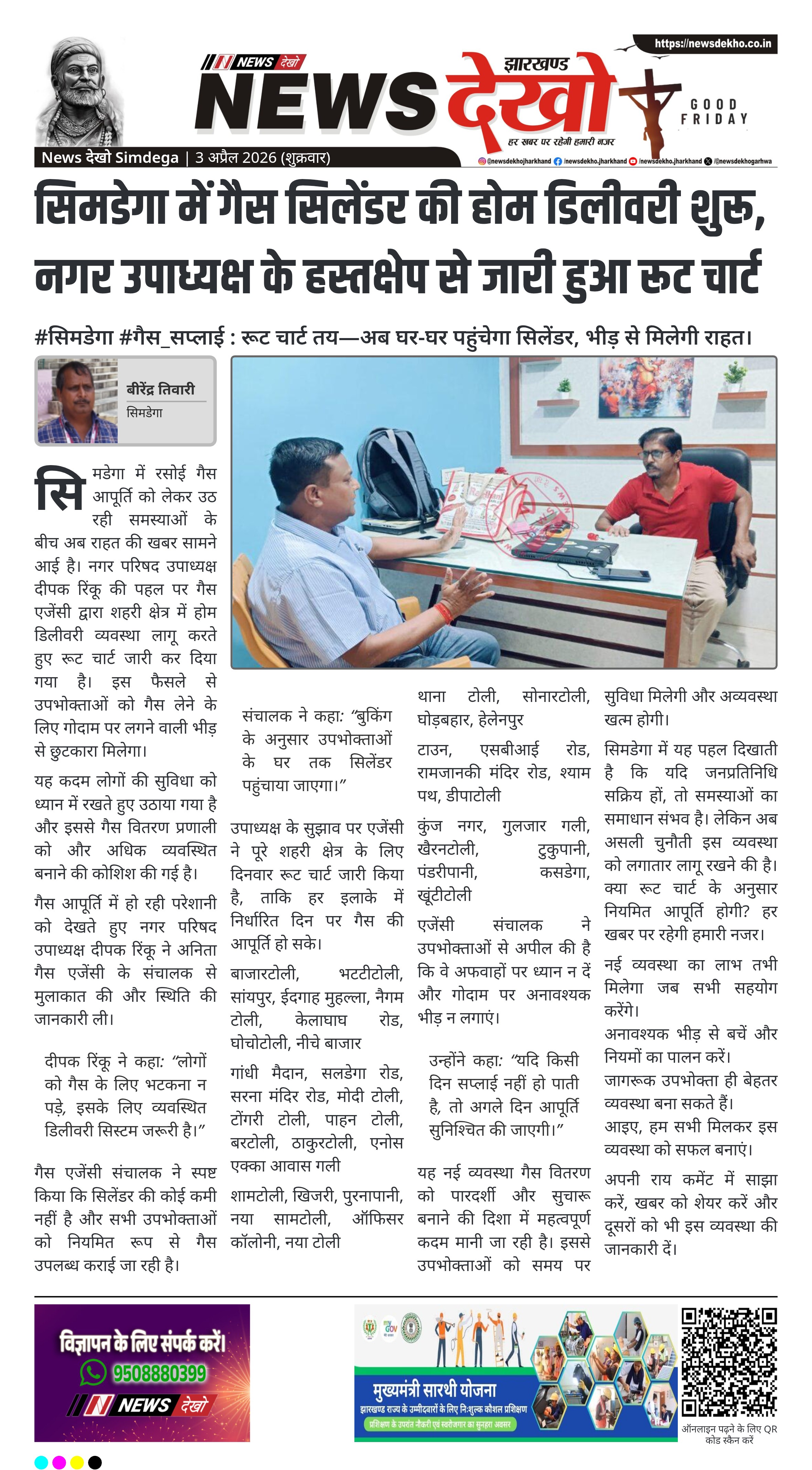 सिमडेगा में रसोई गैस आपूर्ति की समस्या को लेकर नगर परिषद उपाध्यक्ष दीपक रिंकू ने गैस एजेंसी संचालक से बातचीत की। इसके बाद शहरी क्षेत्र में होम डिलीवरी के लिए रूट चार्ट जारी किया गया। एजेंसी ने आश्वासन दिया कि सिलेंडर की कमी नहीं है और बुकिंग के आधार पर घर तक आपूर्ति होगी। इससे उपभोक्ताओं को राहत मिलने की उम्मीद है।